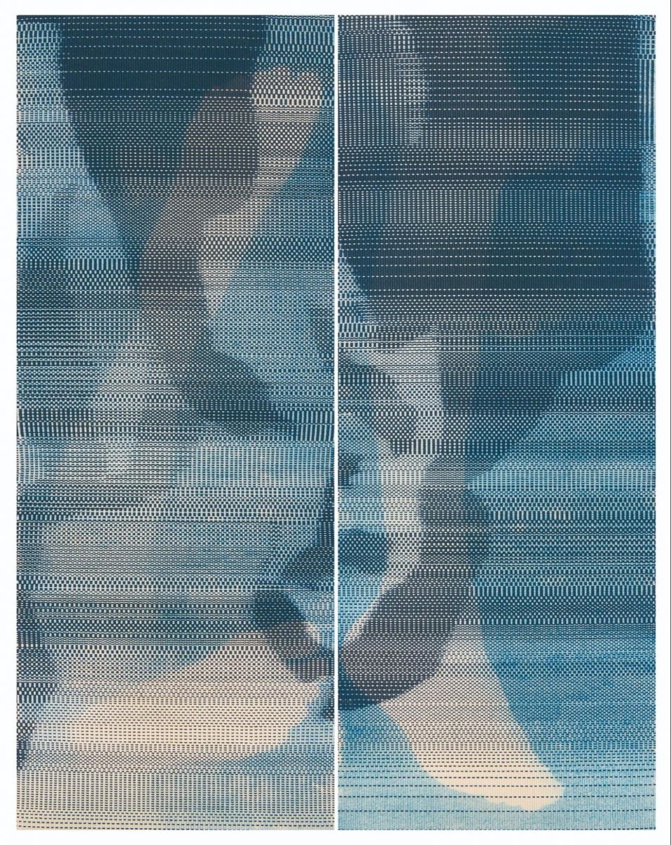 繁田先生:久田多恵先生の『夏の余韻』はとても複雑な技法を使っている作品です。まず自分で糸を染め、たていととよこいとを交差させて平織します。そして、織り上がった布にサイアノタイププリントという技法で形を写していきます。これは、布に感光液を塗って乾燥させ、その上にモチーフを置いて太陽光に当てて露光すると、影になったモチーフ部分だけが白く残り、太陽光が当たった部分は青くなるという技法です。素材を大切にする染織コースならではの、素材感をすごく意識して制作された作品だと思います。