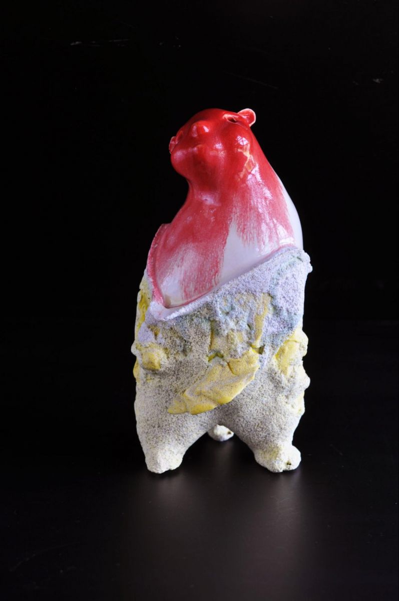 かのう先生は他にも、上半分と下半分で違う焼き方をすることでふたつの表情を表現した山田浩之先生(陶芸コース非常勤講師)の『脱衣獣』や、自身でタイルから制作し、調合した釉薬で絵付けしたという卒業生の田中麻実子さんの『愛と光の中で...#007』などについて解説しました。