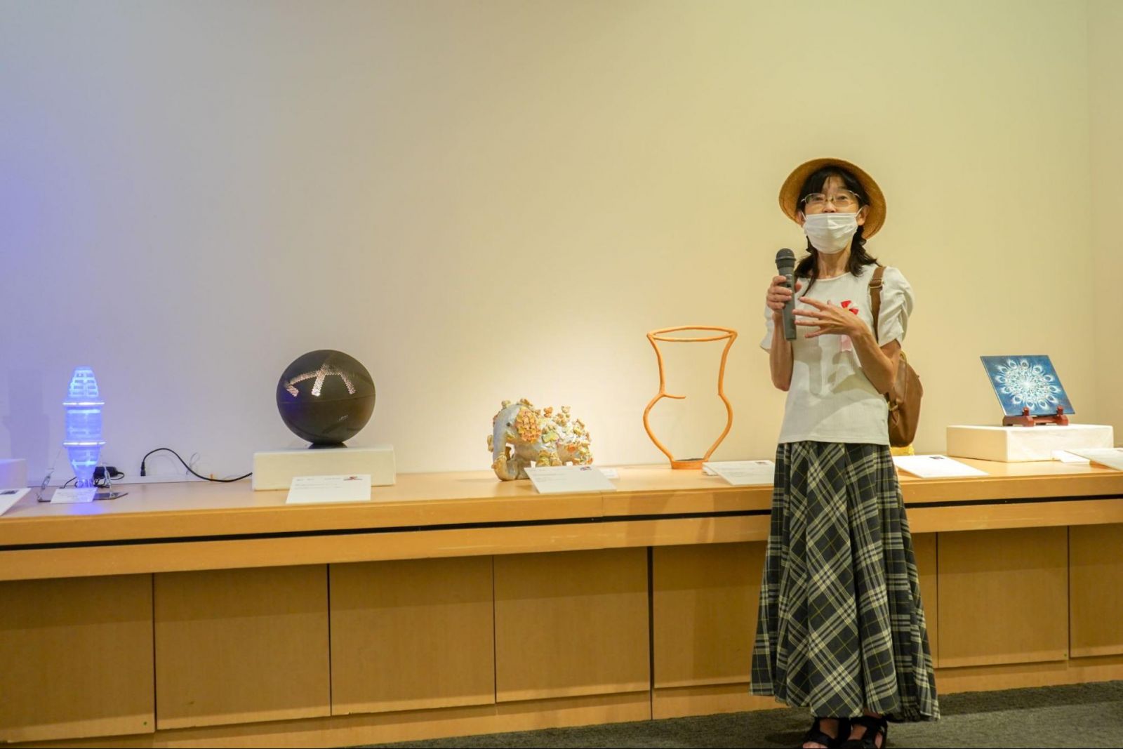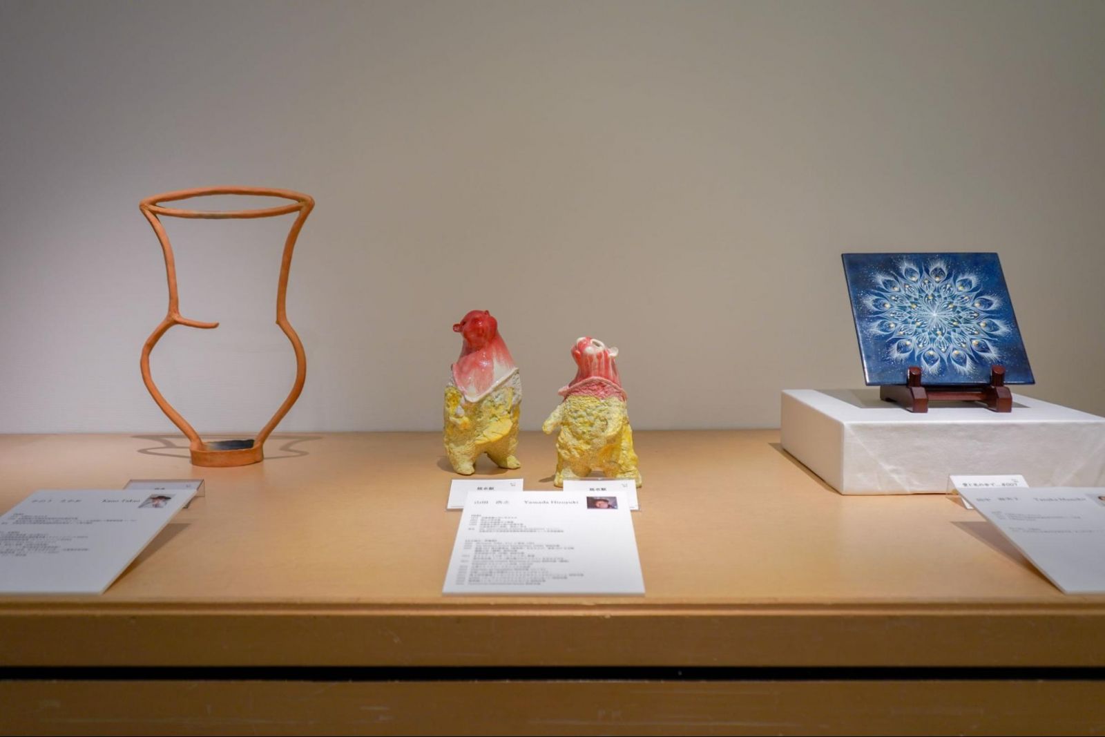 ギャラリー入ってすぐ右手に展示されていたのは大小様々な陶芸作品。陶芸コースは、遠隔学習に加え、大学の工房でスクーリングを取り入れる実践型のカリキュラムが特徴です。今回は教員3名と、卒業生3名の作品が展示されました。