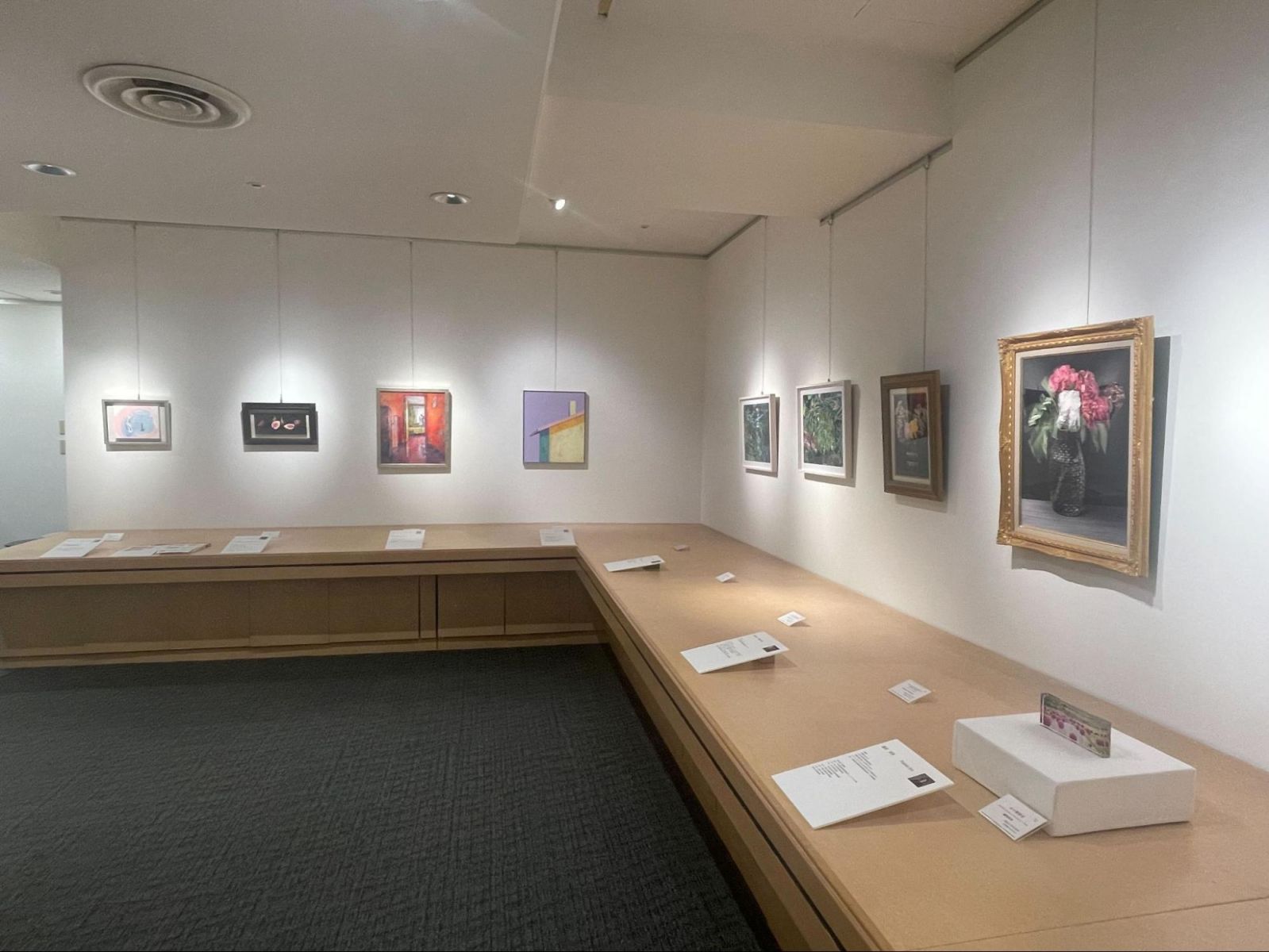 洋画コースの展示には、写実的な油画、アクリル絵の具を使った抽象画、平面を構成する色彩のバランスが目を引くミクストメディアなど、個性豊かな作品が並びました。