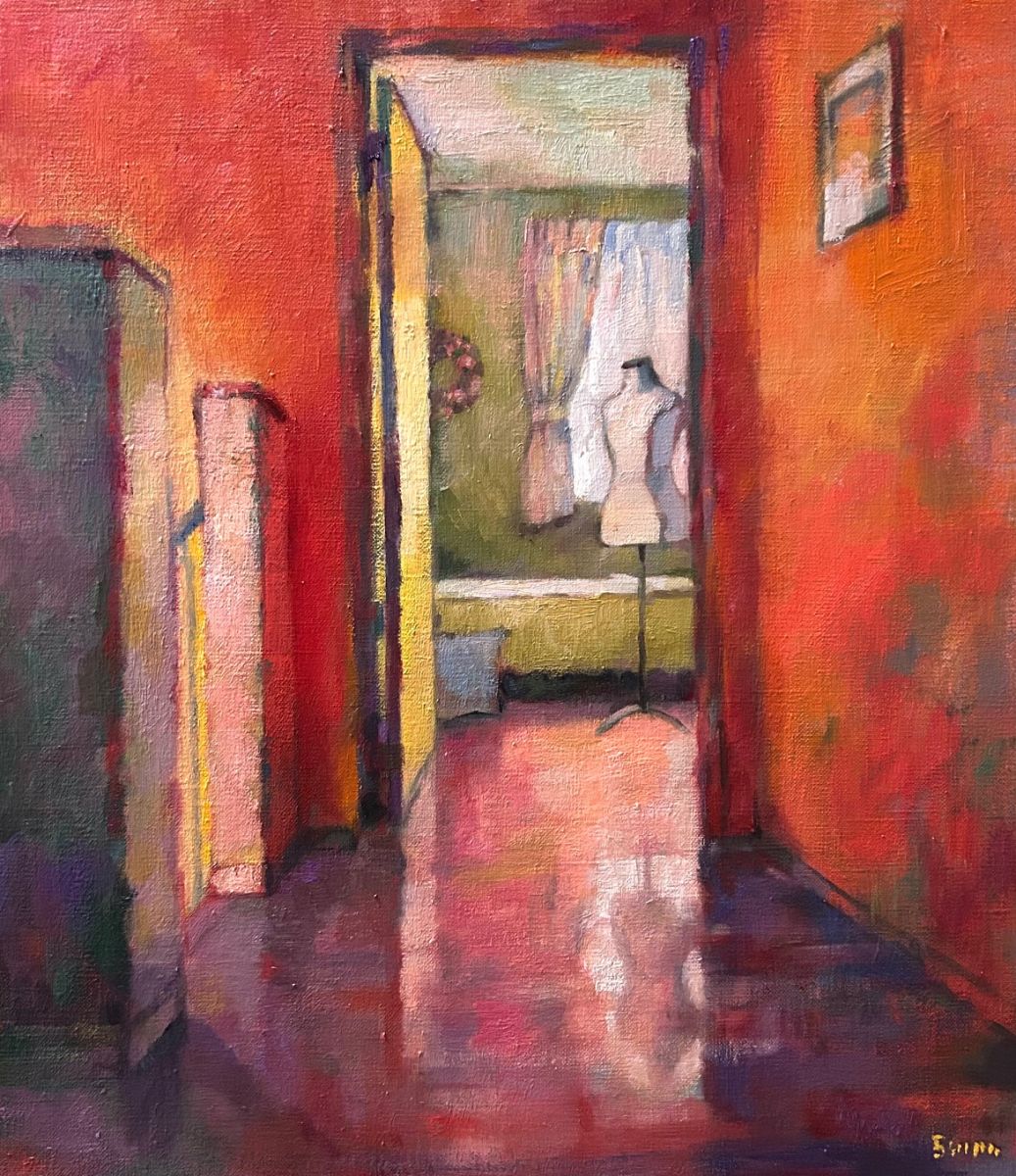 矢野さん:『赤い室内』は自宅の一室を廊下から見たところを描きました。普段過ごしていてちょっと心が動いた瞬間を絵にできたらと思って制作しています。色については映画「アメリ」のカラフルで可愛らしいイメージを意識し、画面の中で色が美しくハーモニーを奏でるような絵画を目指しています。