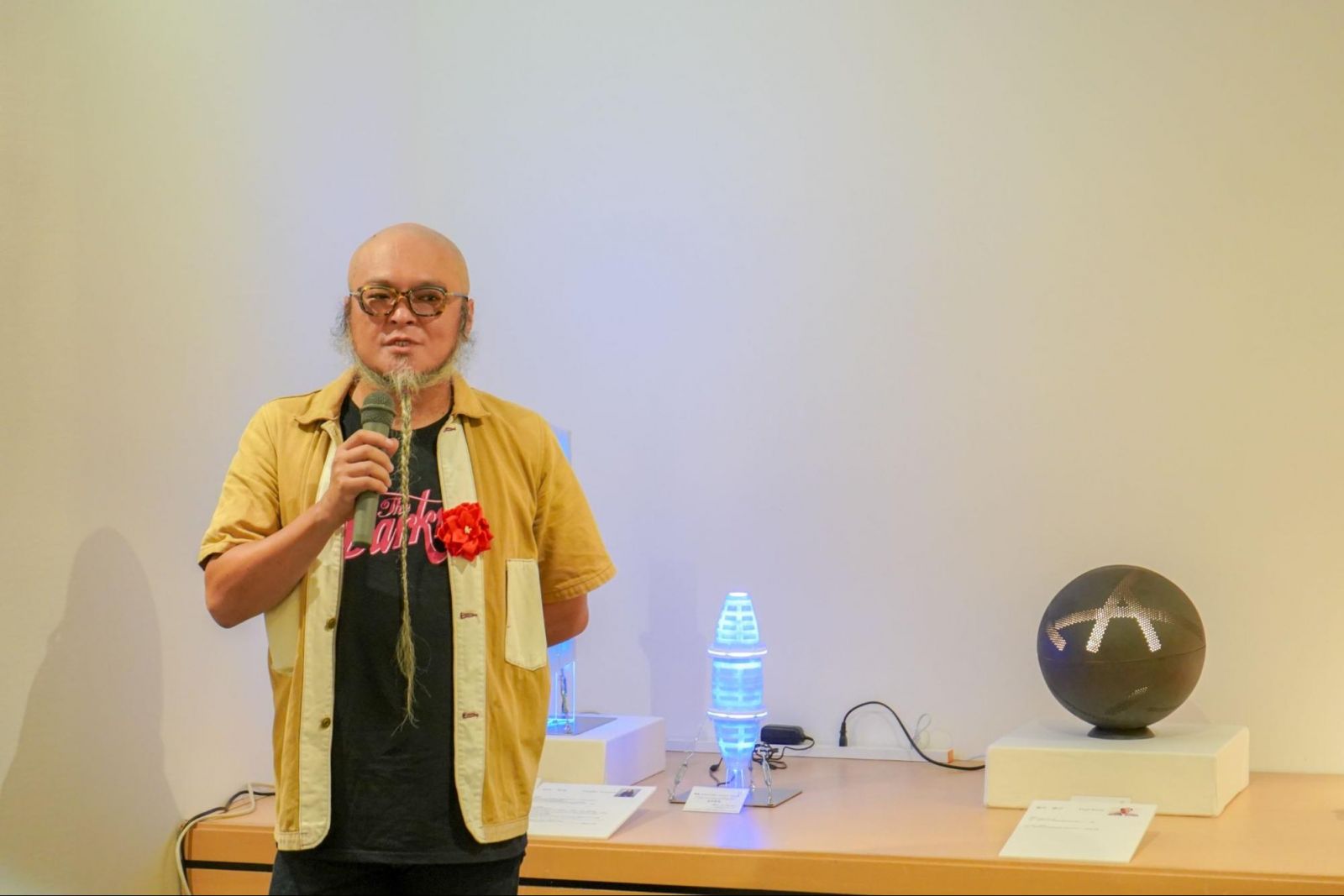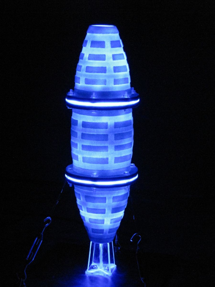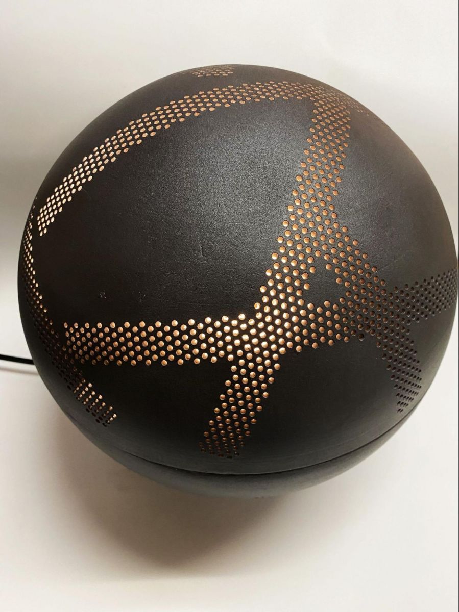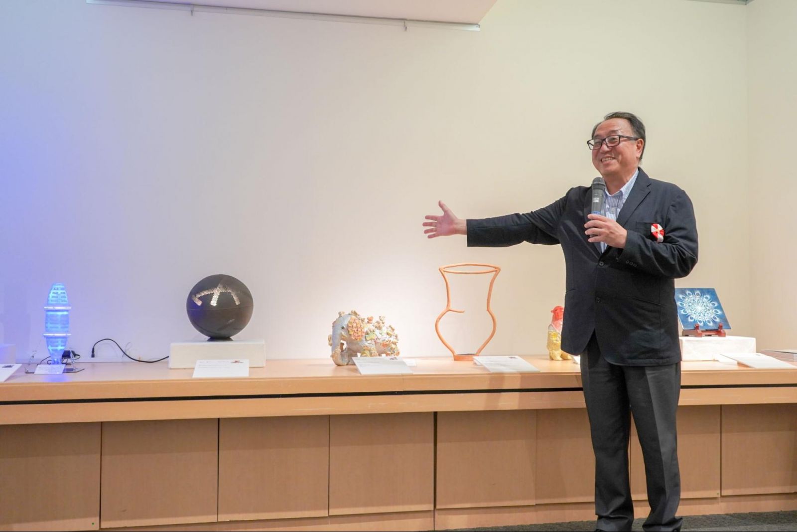 かのう先生:まずぼく自身の陶芸作品『線壺』は、価値観の問い直しをテーマにした作品です。パッと見ると多くの方が「壺だ」と認識すると思うんですが、果たして「輪郭線だけを抜き出しても壺になるんだろうか」ということを問いかける作品です。続いて、田中哲也先生(陶芸コース非常勤講師)の『輝器 KAGAYAKI-Cocoon TypeⅢ』は近年開発された「光を通す土」という素材を使ったミクストメディア作品です。青い光が透けて見えて、パッと目を引きますよね。田中先生は様々な新しい素材を使った表現を研究されています。