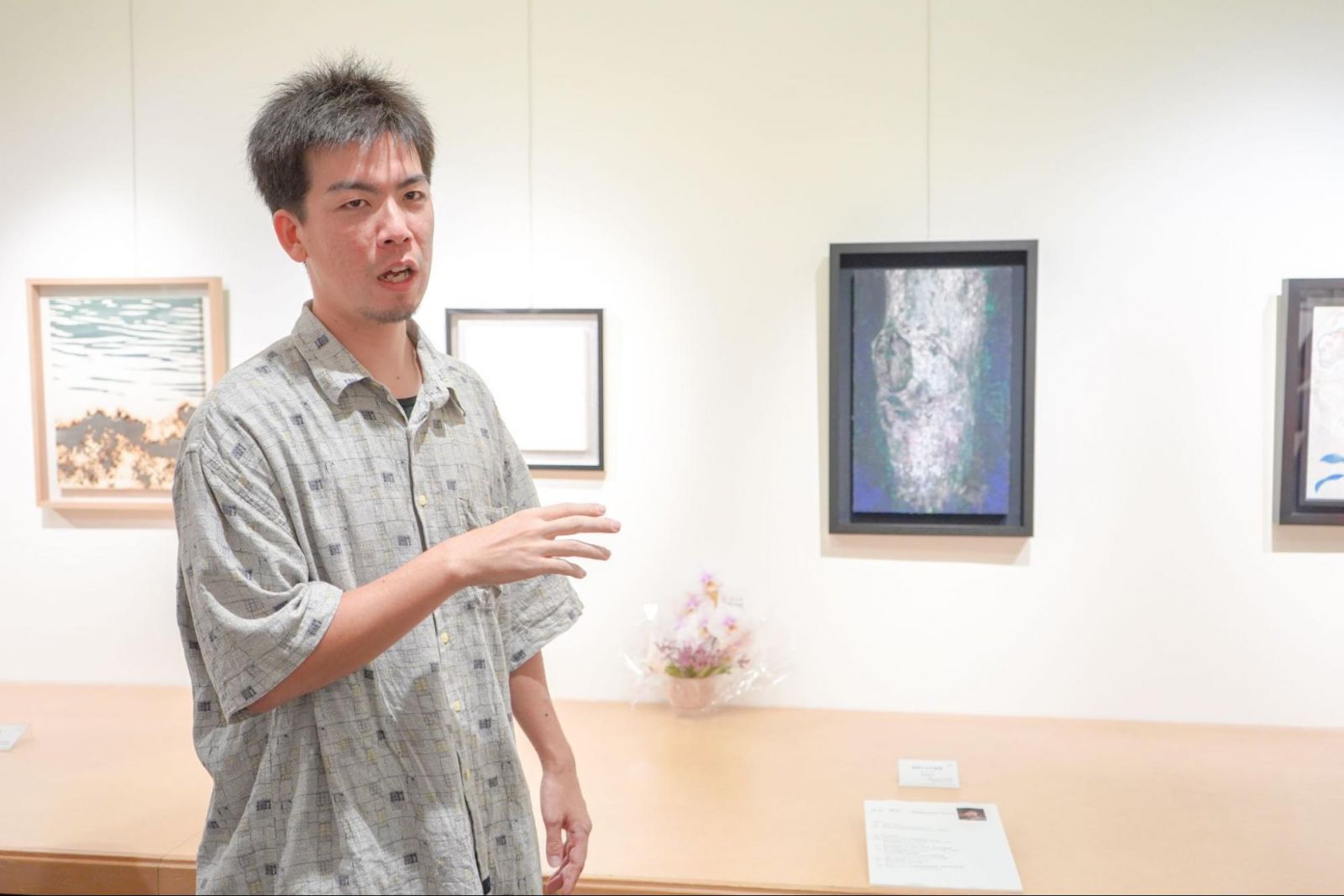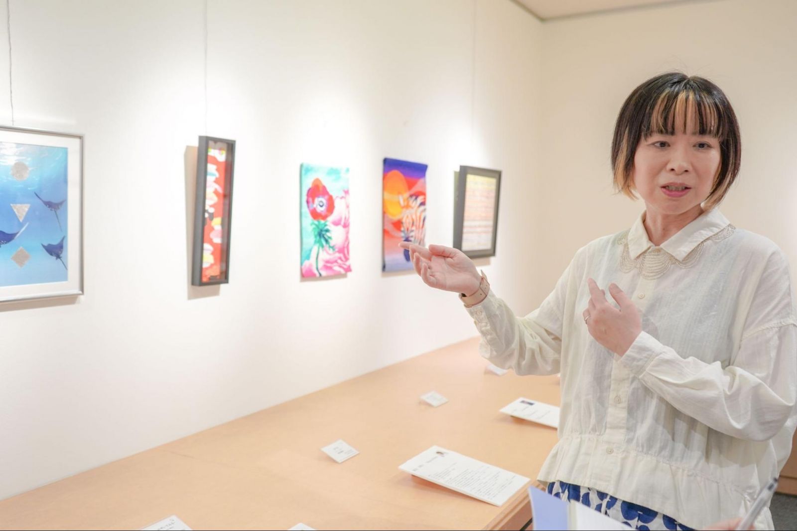 日本画コースでは昨年度の卒業生4人と教員3名が出品しました。多くの学生にとって百貨店での発表ははじめての経験で、販売価格の設定なども含めて社会と接続する貴重な機会となったと山本先生は話します。