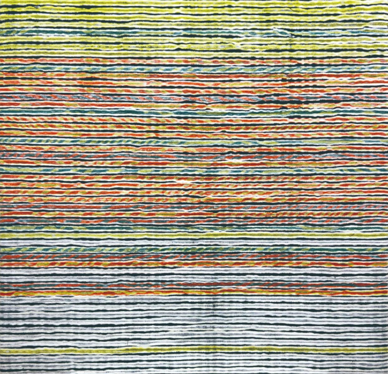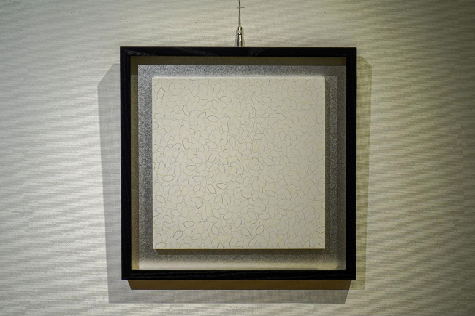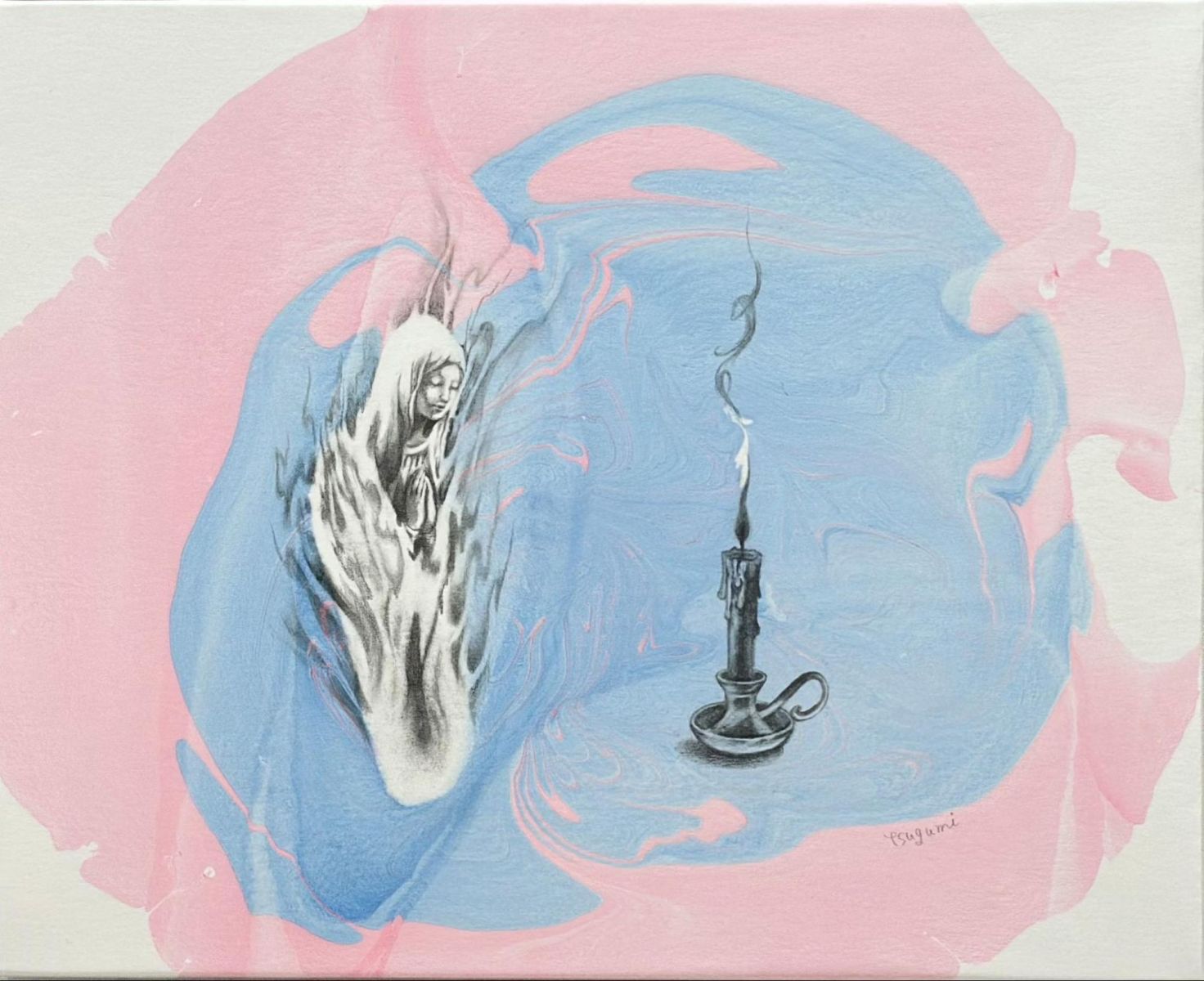 藤田先生の『HOLY SMOKE』はマーブリングと鉛筆によるドローイングの二つの手法を組み合わせた作品です。「キリスト教で司祭が煙で神様とコミュニケーションを取るという話から着想を得て、見えないけれど感じられるものとの瞬間的な接触を描いています」と藤田先生は自作を説明します。