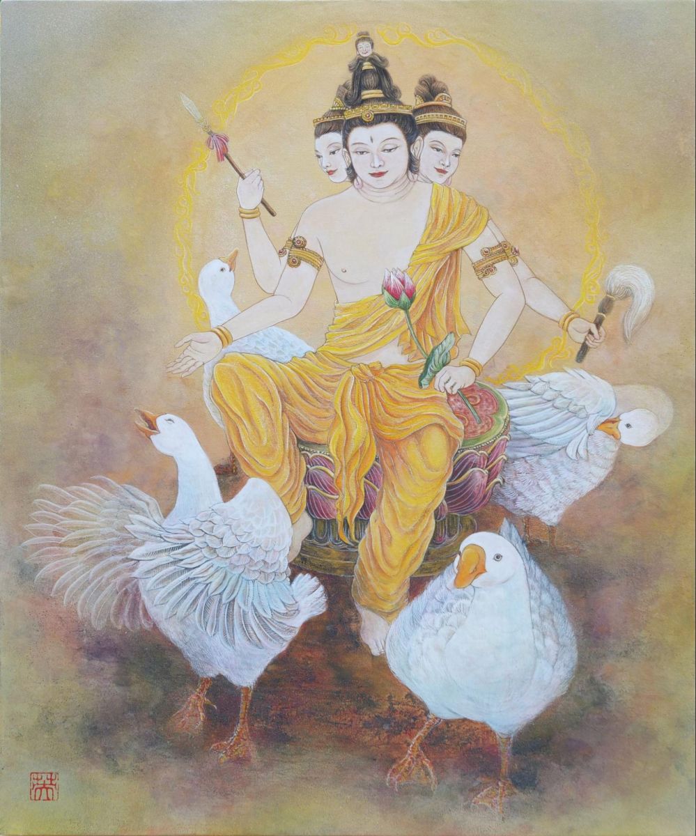 それ以外にも、東寺にある梵天をガチョウと組み合わせて描いた栁橋英里乃さんの『梵天遊戯 東寺』や、日本画用の紙をバーナーで燃やして焼き目をつけ、銀箔を下に敷くことで二層構造を作り出す独特な技法を用いた後藤吉晃先生(日本画コース准教授)の『景』、偏光顔料を使用し、見る角度や距離によってモチーフの見え方を変化させることで、身近なものを改めて見つめ直す山本先生の『Rainbow rice』など、多様な技法を用いた作品が展示されていました。