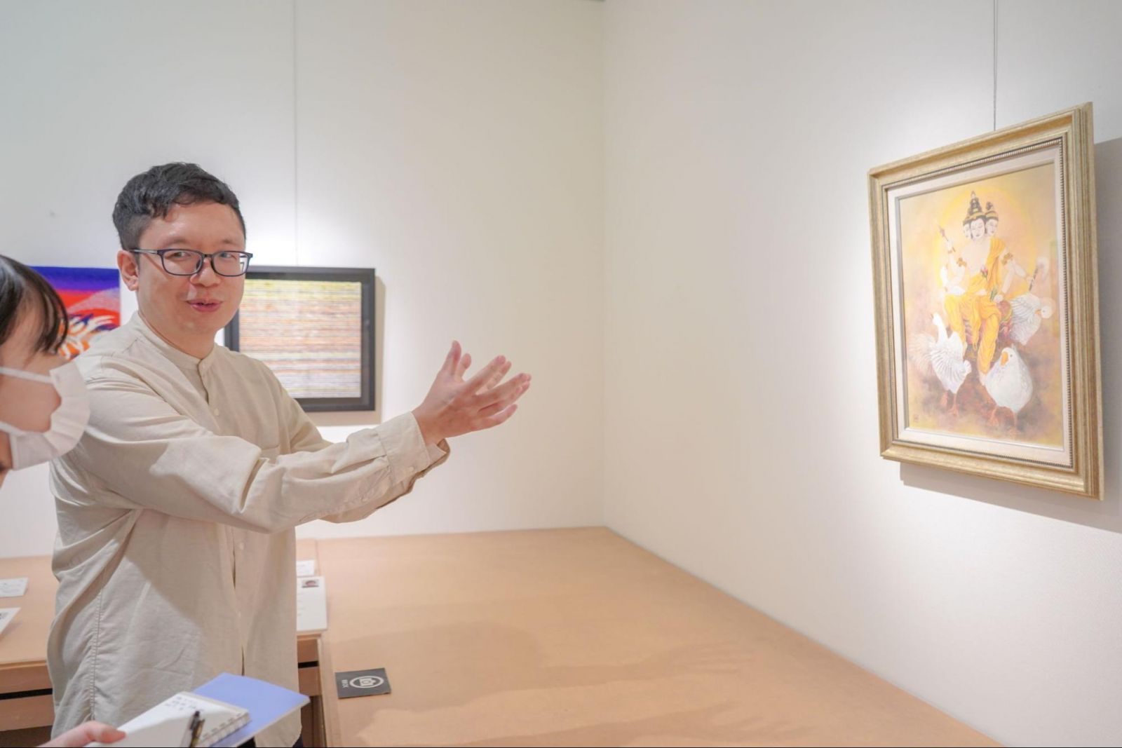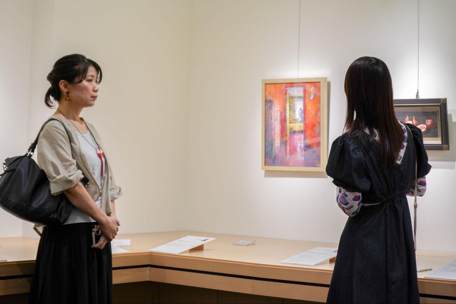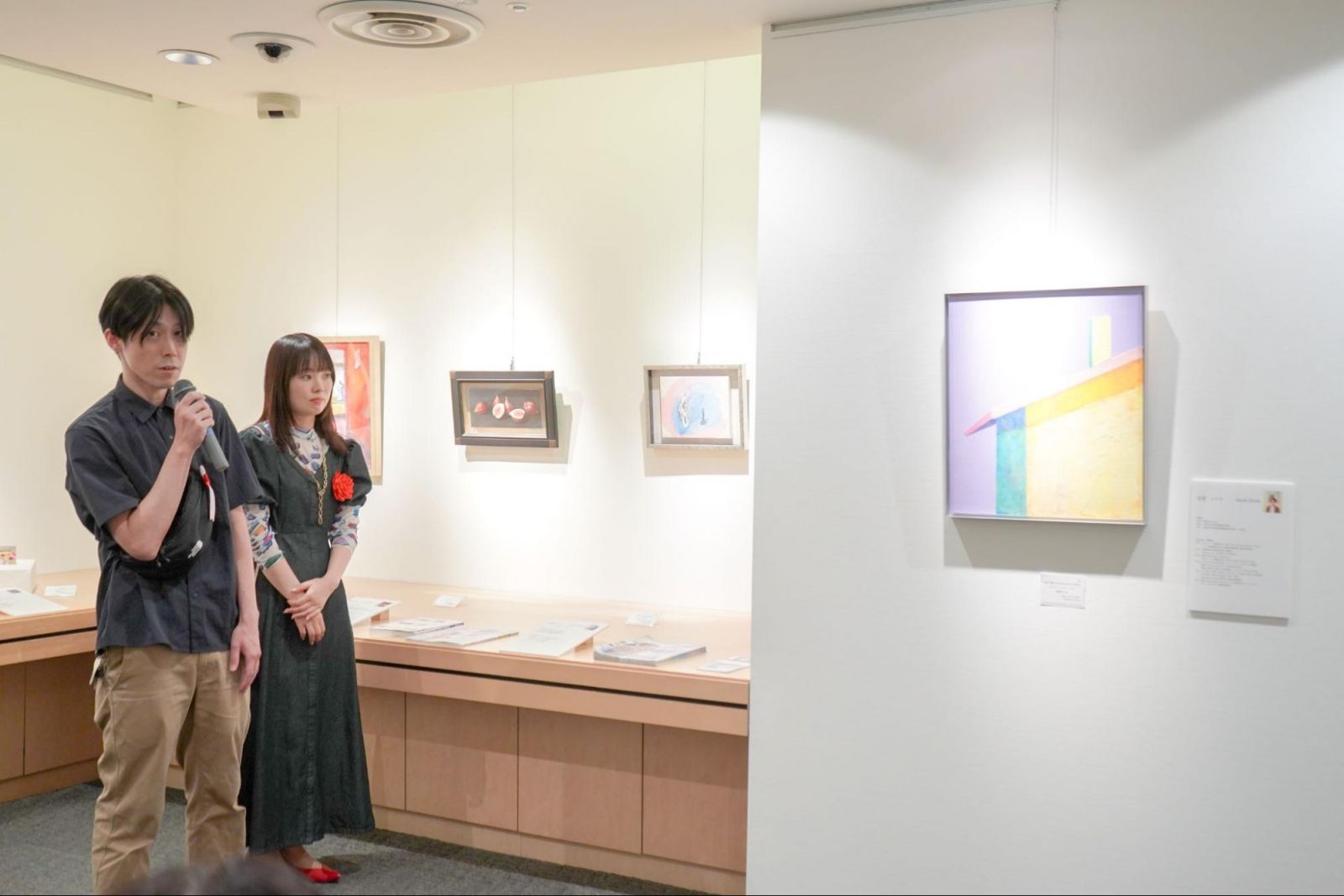 ギャラリートークに登壇した卒業生の佐東ヒロキさんと矢野さやかさんは、どちらも色彩の表現が特徴的な作品を展示しました。