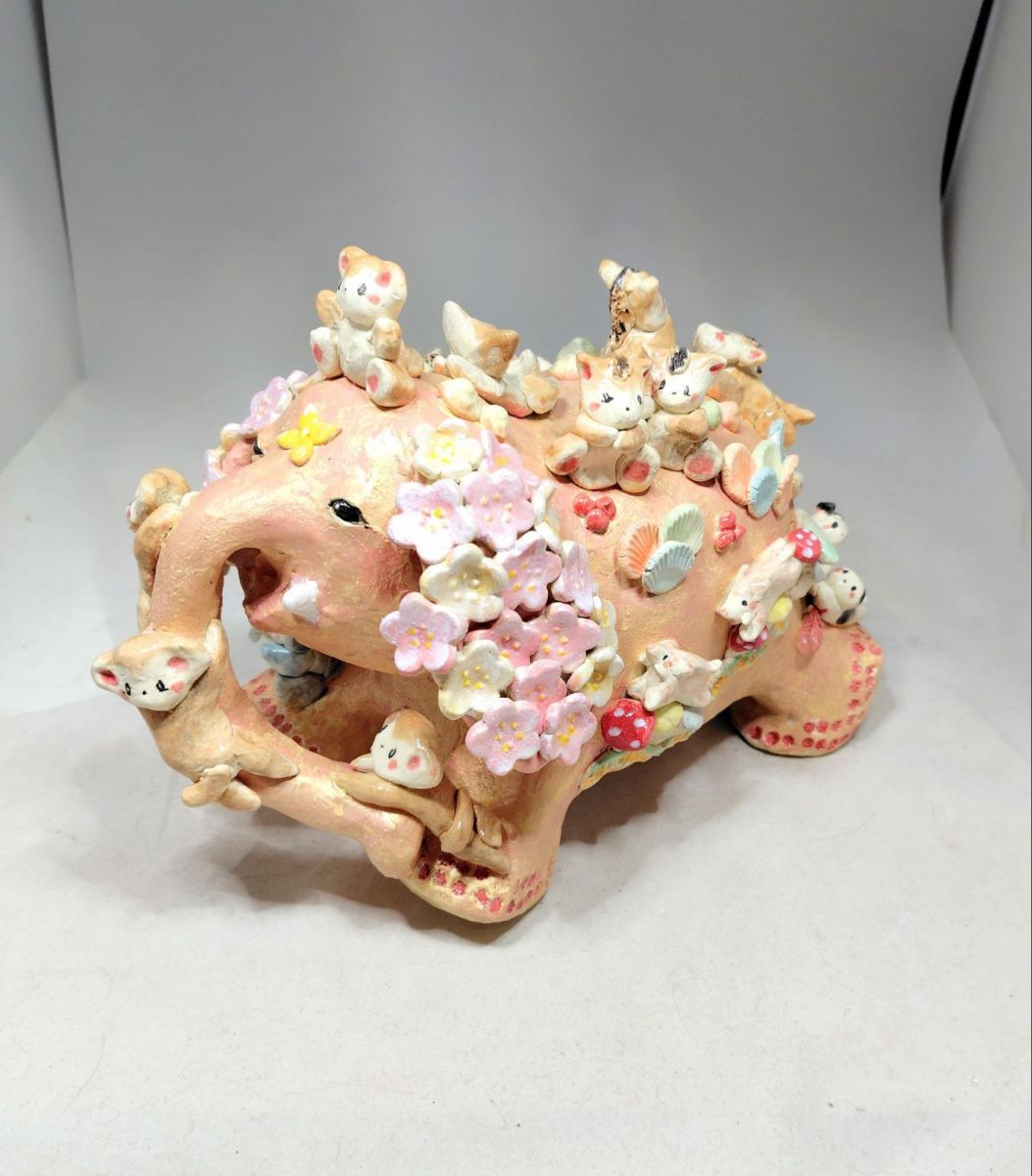 市田さん:『IBASHOシリーズ ~象バージョンピンクⅠ~』は、土家由岐雄作の「かわいそうなゾウ」(太平洋戦争中の上野動物園で、ゾウが戦時猛獣処分を受けた実話をもとにした絵本)をモチーフにした作品です。わたしは「居場所」をテーマに制作しています。現代社会は、物理的なバリアフリーは進んだものの、心のバリアフリーは進んでいないと思います。そんな社会の中で、悩んでいる人たちが、作品を見ることで心が安らぐような作品をこれからも作っていきたいです。