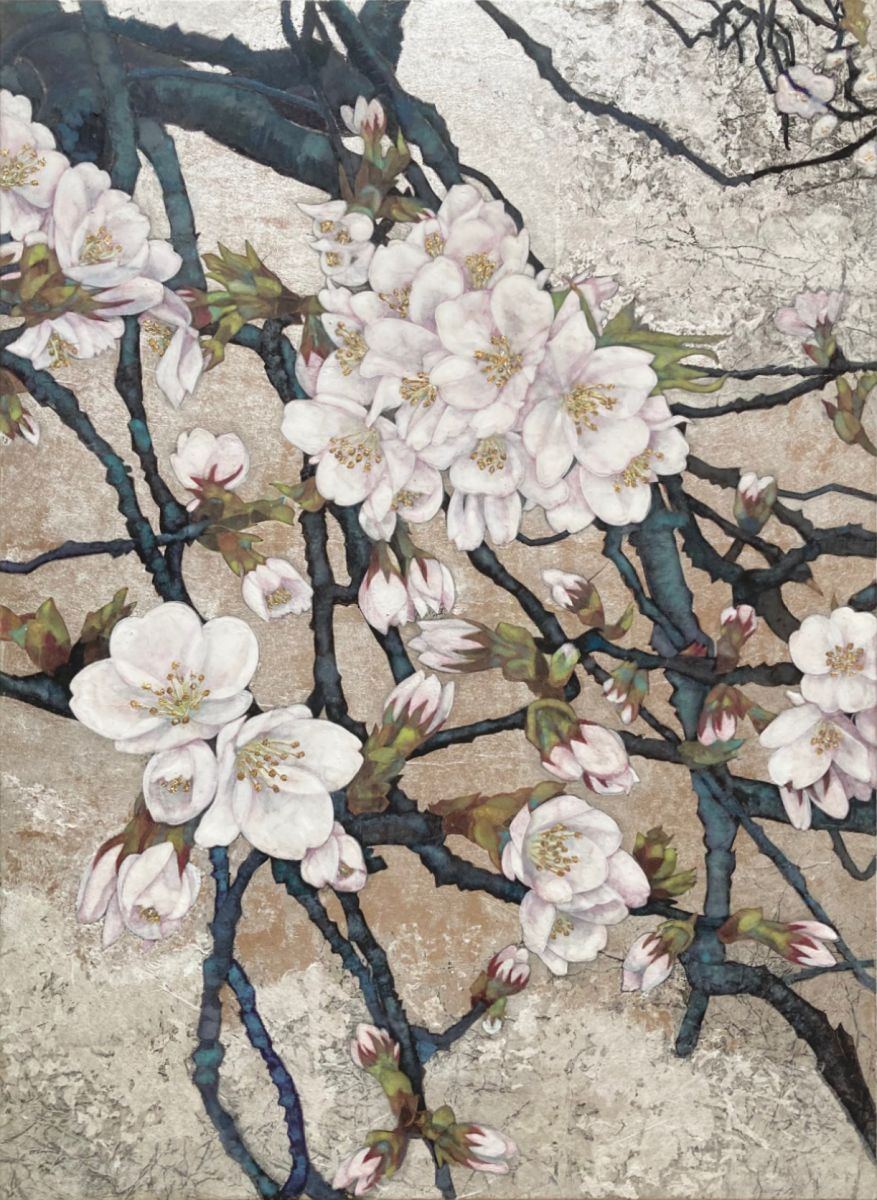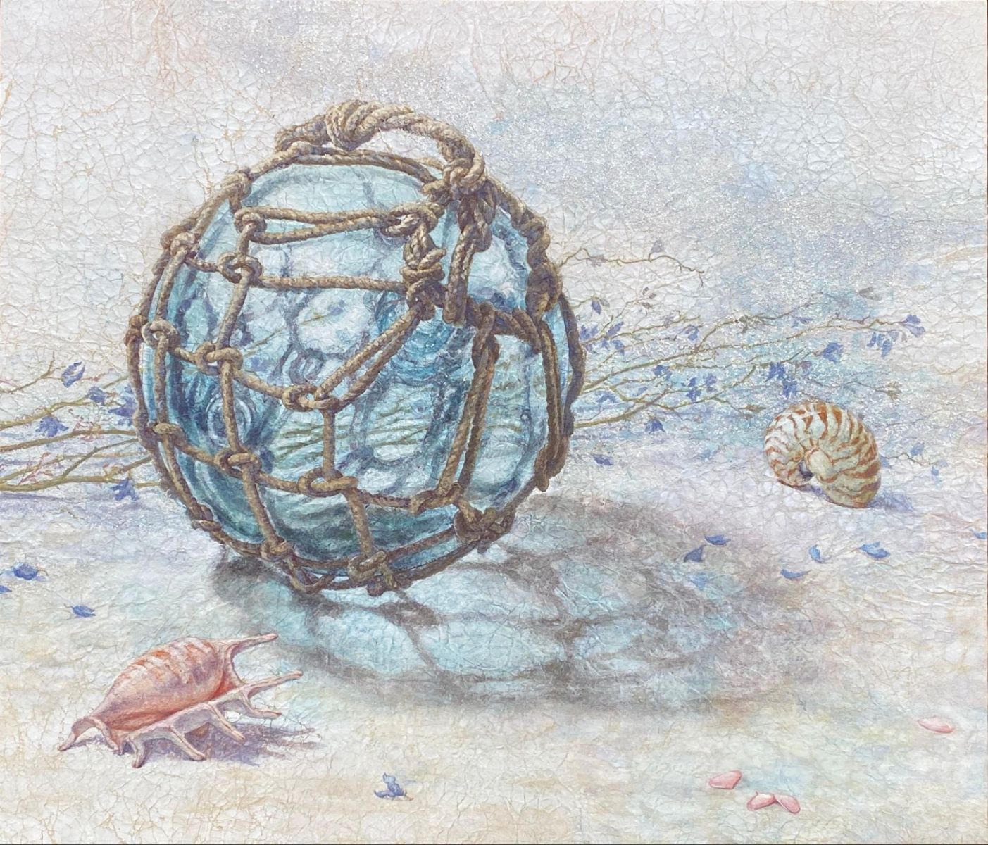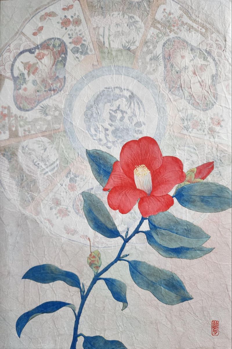 山本先生:春原敦子さんの『桜』は、背景に銀箔を使い、「たらしこみ」という技法で水をたっぷり含んだ筆で枝を描き、金箔で花を表現した作品です。山本純子さんの『君がため』は百人一首の『君がため惜しからざりし命さへながくもがなと思ひけるかな』という歌をモチーフにしています。こだわりのポイントは椿の赤色と葉っぱの青色なのだそうです。発色のいい天然の岩絵の具を使用しています。石橋和美さんの『海への想い』は、プラスチックの浮き玉とその影、貝殻などのモチーフを組み合わせて画面を構成した作品です。紙をくしゃくしゃと揉み込む「もみ紙」という日本画の技法によって、独特の質感を表現しています。