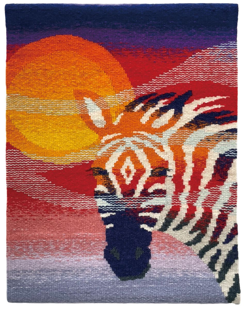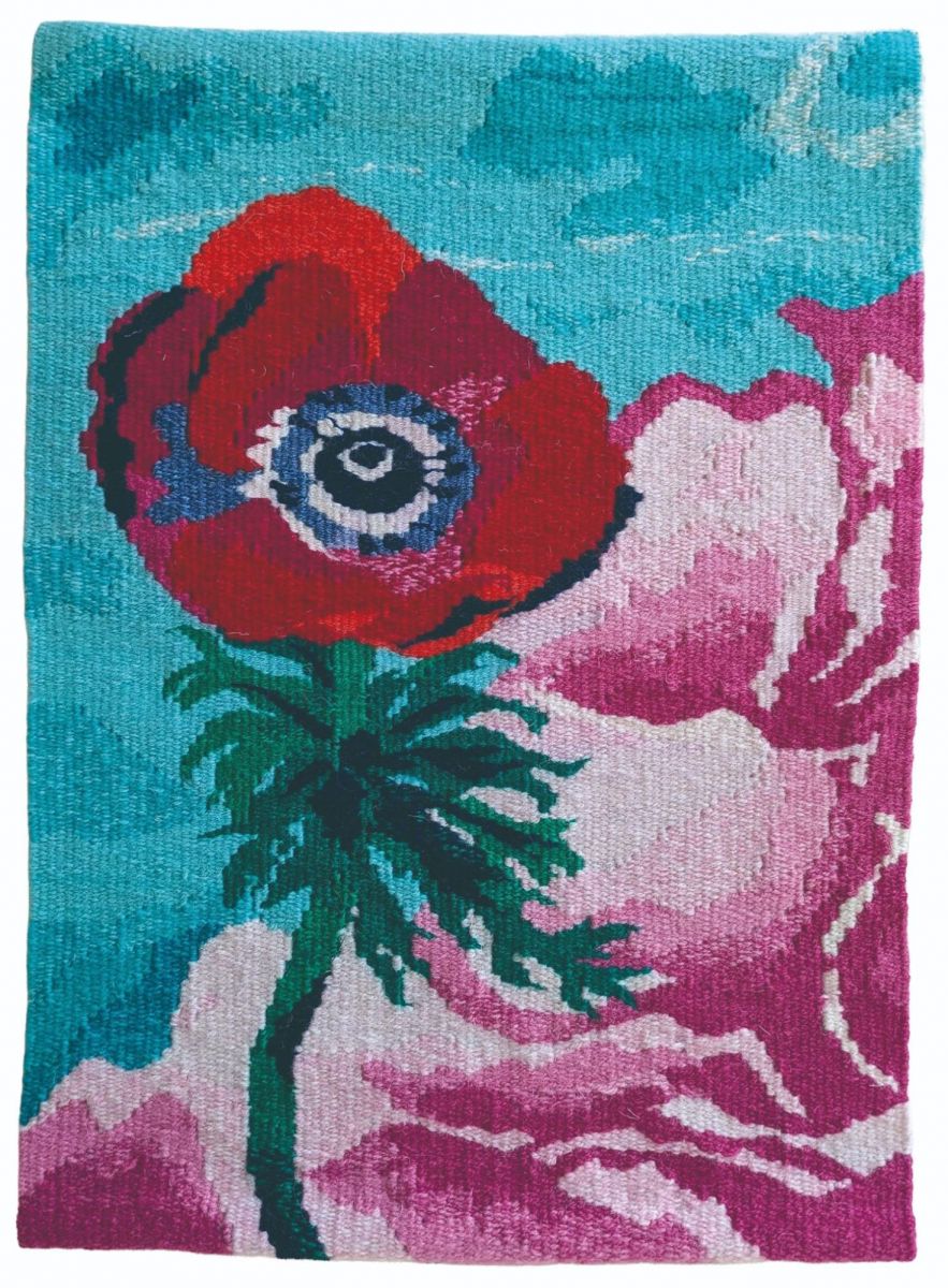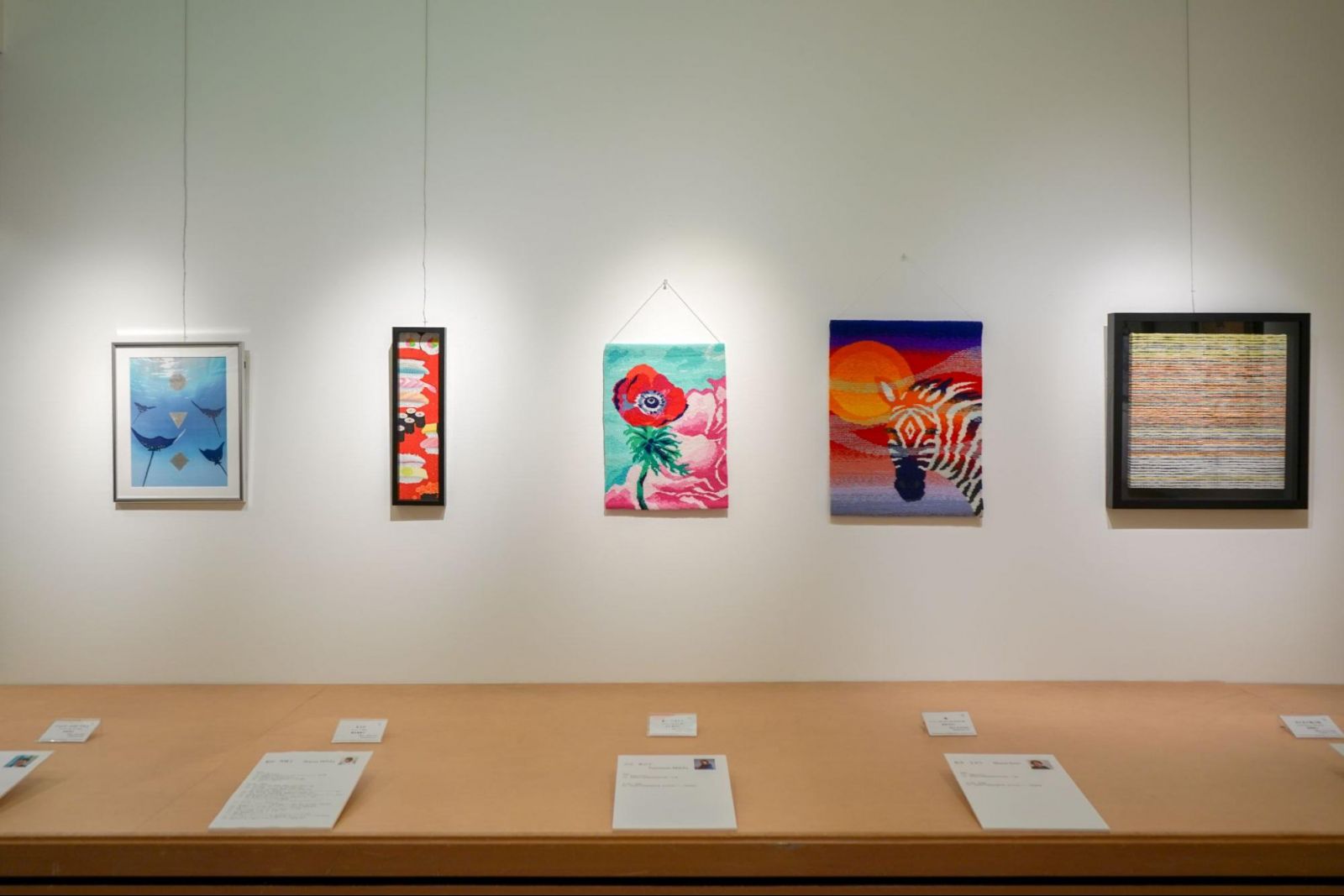 こちらの高橋桃子先生(染織コース非常勤講師)の『点と点が結ぶ時』は絞り染めの技法を使った作品です。卒業生の山元真己子さんの『憂い たゆたう』は綴織の作品で、卒業制作展でコース奨励賞を受賞され、コース紹介パンフレットの表紙にも採用された山元さんの卒業制作作品と同じ、アネモネをモチーフにしています。松井さおりさんの『風』も同じく綴織で、自分で糸を染め、染めた糸を織るという時間のかかる手法を使って制作されています。