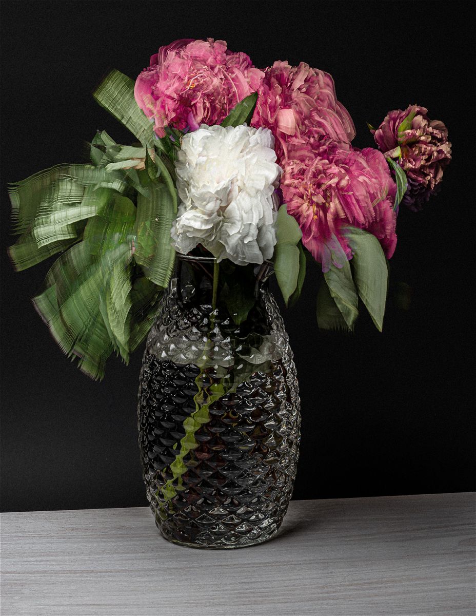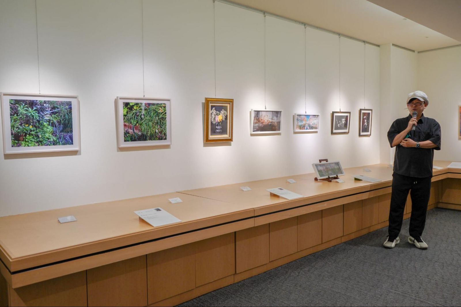 勝又先生は他にも、アクリルキューブにUVプリントで花の画像を印刷した藤岡亜弥先生(写真コース専任講師)の『日々是好日』や、静物画のような画面構成と、油絵のようなフレームによって絵画史の伝統を見る人に想起させるakemori hirokazuさんの『Vase de pivoines/Hommage à Édouard Manet』、京都市内の庭を長年撮り続けているライフワーク作品の一点である片岡俊先生(写真コース非常勤講師)の『Life Works #60』について、写真という芸術の歴史や技法の説明を交えて解説しました。