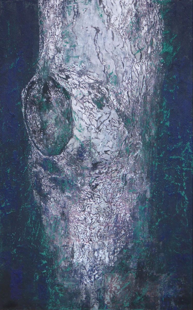 岸本先生:わたしの『痕跡のある風景』は樹木を描いた作品で、自然の有機的な形を観察して描いています。絵の具を分厚く盛り上げて、絵の具の質感とモチーフが上手く噛み合うような表現を探しながら制作しました。色は灰色と黒がベースですが、青や緑も使い、銀鼠や紫鼠といった微妙な色味を組み合わせて樹木を表現しています。