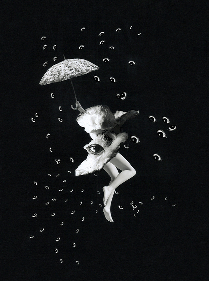 SEKIさん:『雨がふっても傘をさして踊ればいい』では、固定観念から抜け出すことを大きなテーマとしています。自分で撮った写真とネット上のフリー素材を使い、一旦デジタル上で構成した後、プリントアウトして1つ1つのパーツに分けてアナログで切り張りしています。アクリル絵の具や生地、ダンボール、新聞紙なども使用し、いろんな領域を超えて1つの作品にしたいと考えています。