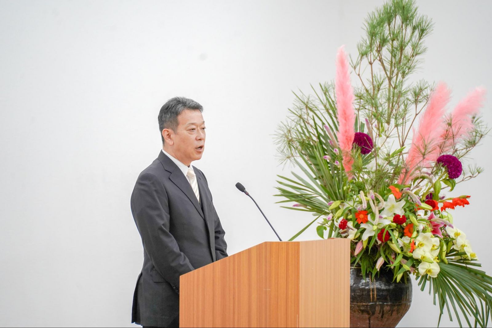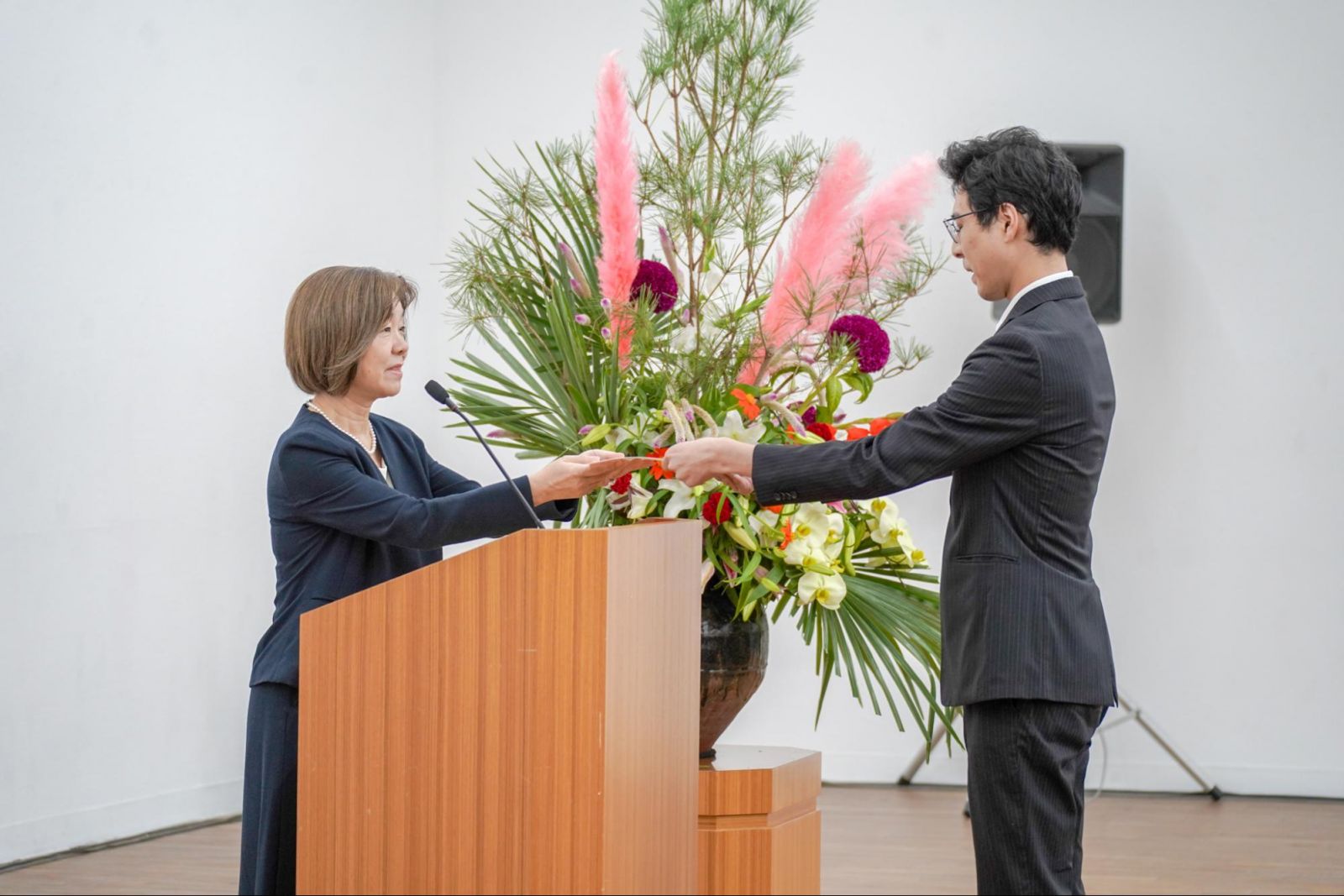 卒業生からの芸術への真摯な思いを受け取り、徳山豊理事長から歓送の辞が贈られました。徳山理事長は「『大学ってなんだろう』と考えました。もちろん、社会で生き抜いていくために力をつける、学ぶ、自分を成長させる場所であることは間違いありません。しかし、今の日本や世界は、幸せな社会とは言い難いのが現状です。今この瞬間も、世界中の至るところで悲しい出来事が続いている中で、新聞やニュースで見かける悲惨な状況から目を逸らすことしかできない。そう思ってしまうくらい、私たちは無力です。だからといって、なにもしなくてもいいわけではない。教育とは、『私たちは今、なにができるか』を考え続け、想像する力を身につける、そういう場所ではないかと私は思います」と教育への考え方を話し、教職員一同、建学の理念である『藝術立国』の精神を大切にして、教育に向き合っていきたいと述べました。