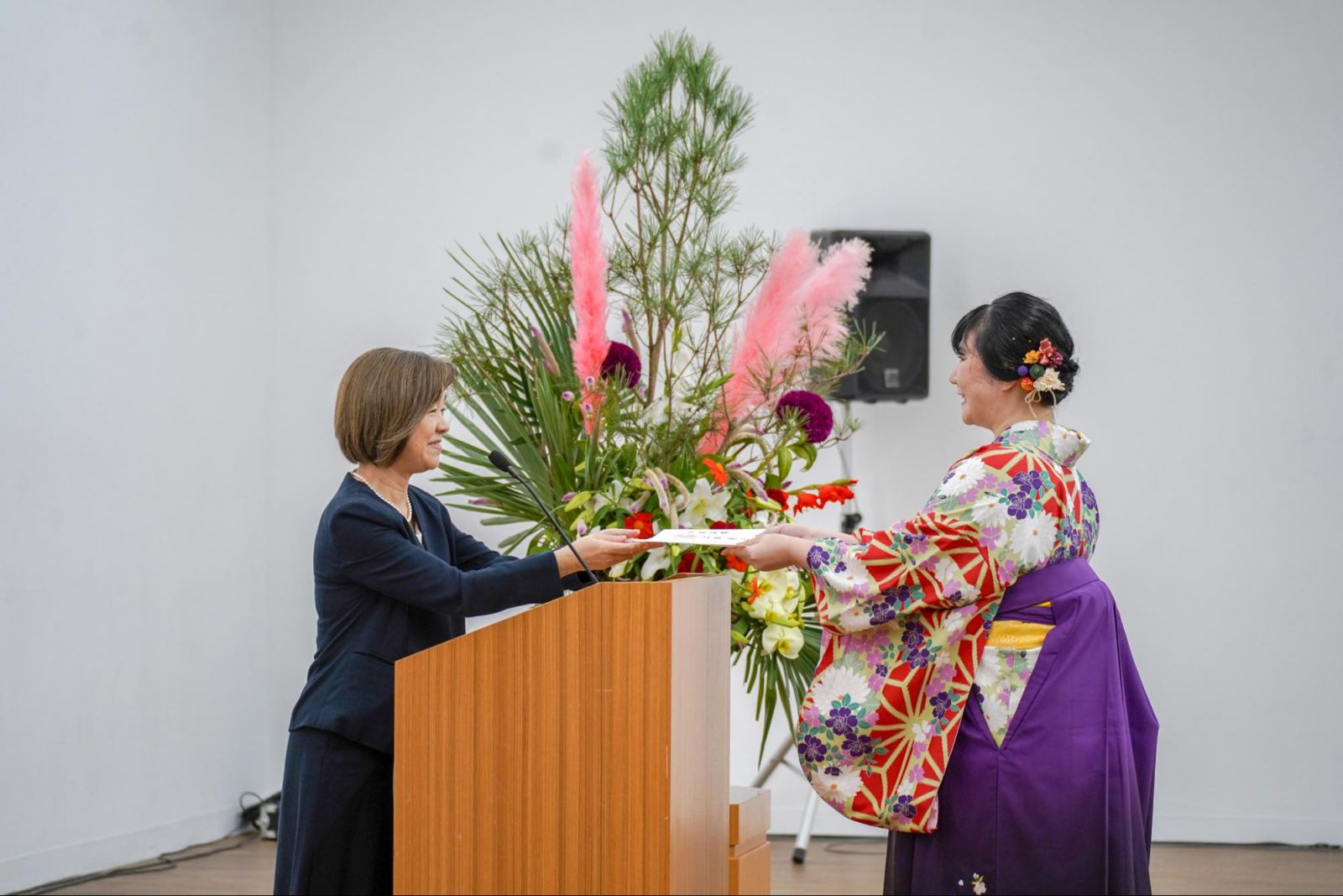 本学の通信教育課程芸術教養学科は完全オンラインでどこでも学べるのが特徴。この秋季卒業式には、全国各地や海外など様々な地域からオンライン授業を受講し学位を取得された方が参列されました。