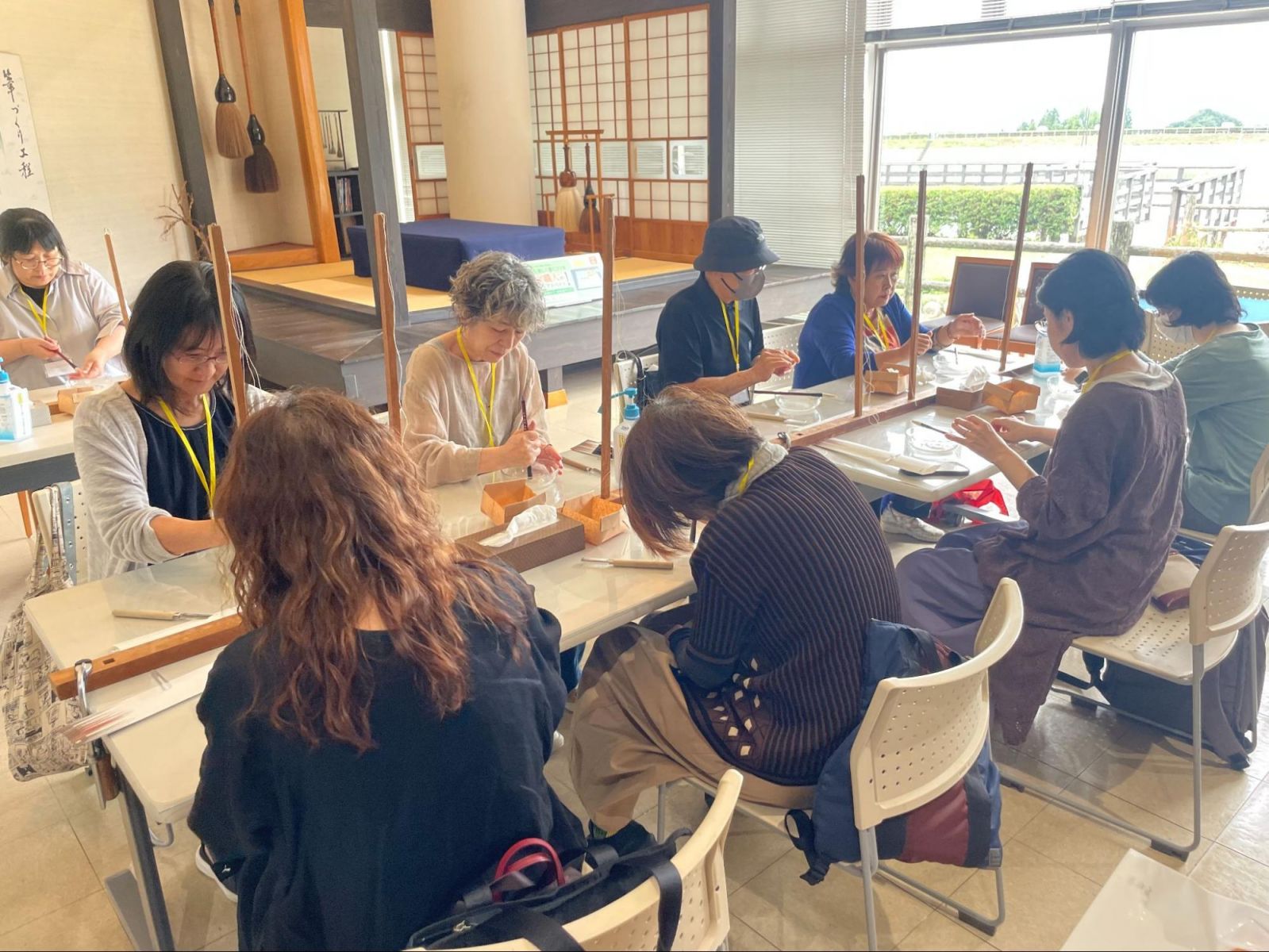 当日は全国各地から、所属コースもさまざまな30名の学生が参加しました。広島駅前に集合後、チャーターバスで「筆の里工房」へ向かいました。現地では筆職人の方のご指導のもと、筆作り体験を行いました。