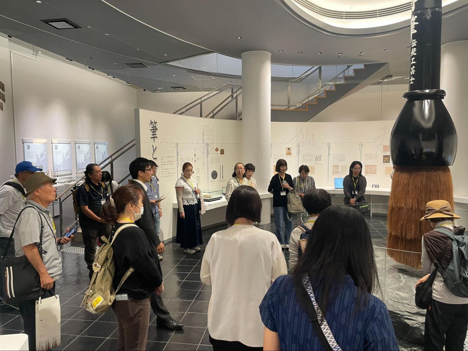 体験内容は筆づくりの最終段階で、軸に入った穂先に水のりを付け、糸で絞りながら形を整えるという工程でした。短い時間でしたが、筆づくりの奥深さを知ることができました。続いて松村さんによる館内案内と筆の歴史解説があり、展示されている多様な筆や硯などの資料を見学しました。丁寧な解説もあり、大変勉強になる時間でした。