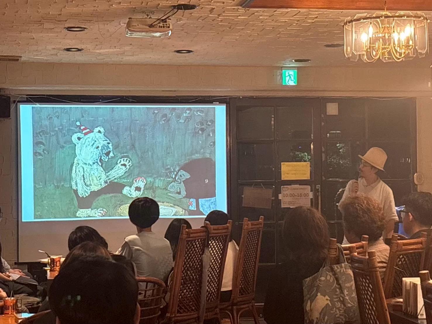 イベントができるということで、店内に入ってすぐの場所には、スクリーンがありました。今回は、店長さんの協力のもと、私たち文芸表現学科の学生も、芸術のおもしろさをより多くの大人の方に知ってもらうため、絵本作家の谷口智則さんをお招きして「大人のための絵本時間」というイベントを開催しました。