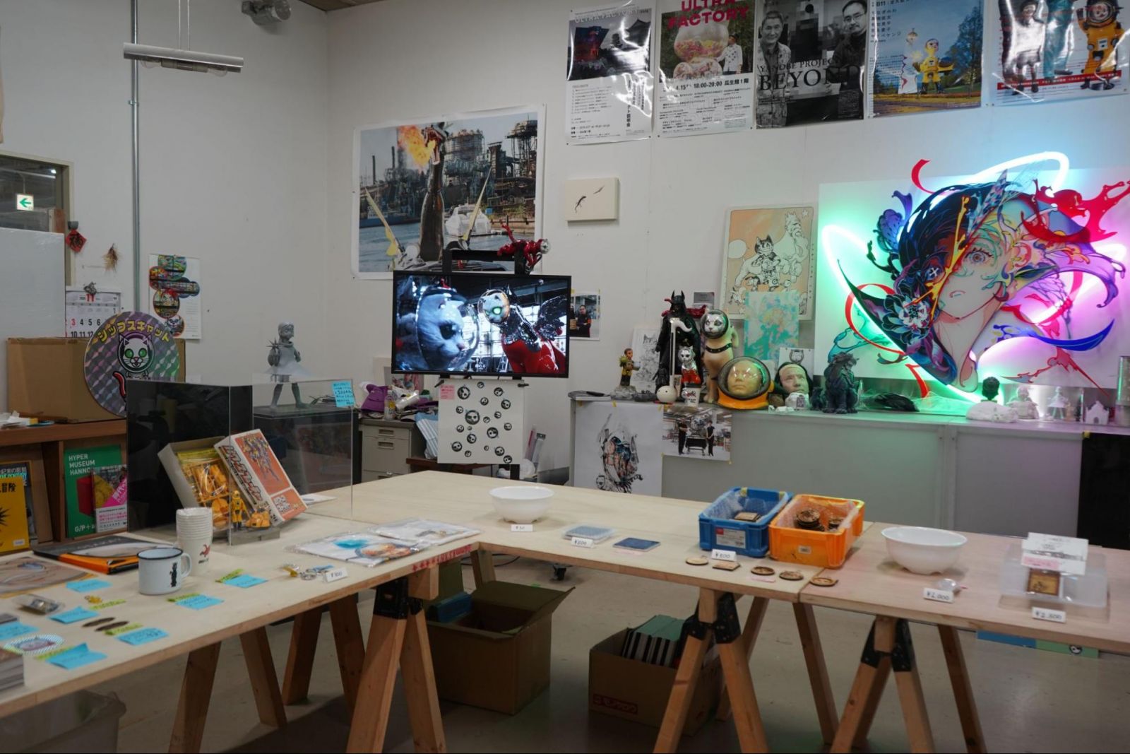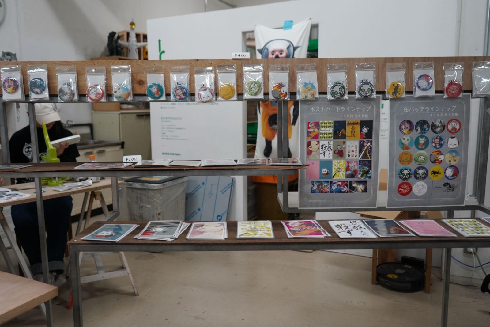 ここでヤノベケンジ先生の「SHIP'S CAT(シップス・キャット)」のキャラクターに案内され、人間館を離れて至誠館へ。ULTRA-Wプロジェクト特別企画として、ウルトラファクトリーの金属加工などを行う工房を見学できるほか、「ULTRA POP UP!」ではプロジェクトメンバーによって制作された種類豊富なグッズが販売されていました。ウルトラファクトリーのポストカードやキーホルダー、『ヤノベケンジ LUCA:THE LANDING』で大人気のSHIP'S CATのお面まで! 子どもから大人まで気軽に楽しみながらものづくりに触れることのできる、貴重な機会となりました。