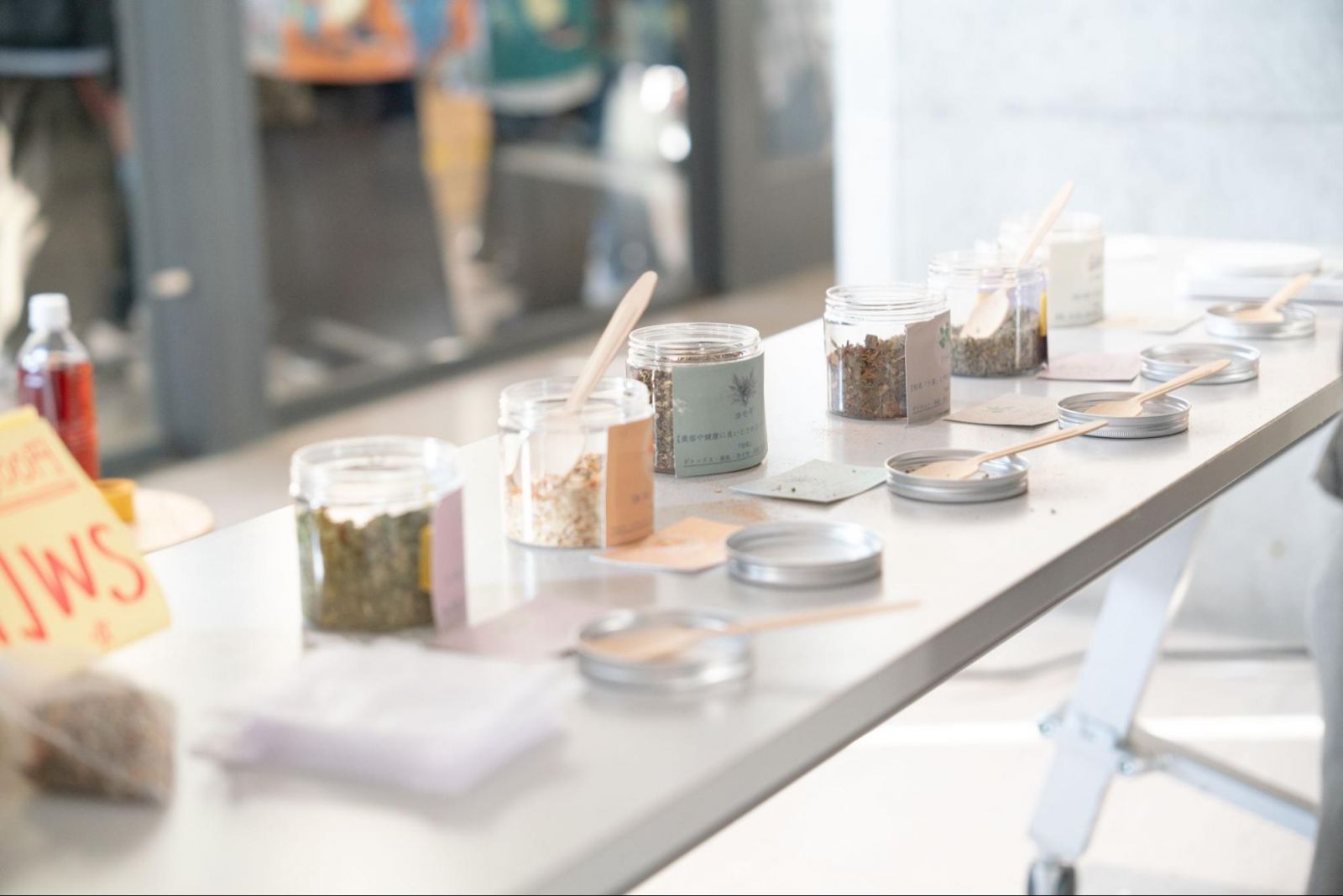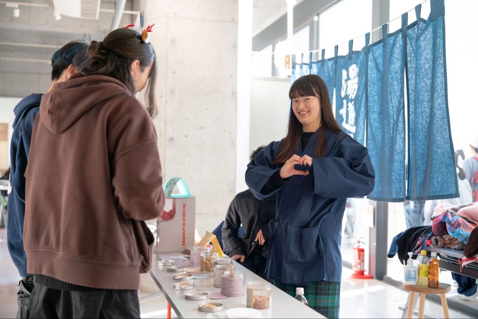 湯道部は小山薫堂副学長を顧問に2023年2月から活動を開始した、現在減少傾向にある銭湯業界を盛り上げるために活動するサークルです。ブースでは湯道部についての紹介パンフレットの配布や湯道部タオルの販売、様々な種類のハーブを組み合わせることでオリジナルの入浴剤を作るワークショップを開催していました。