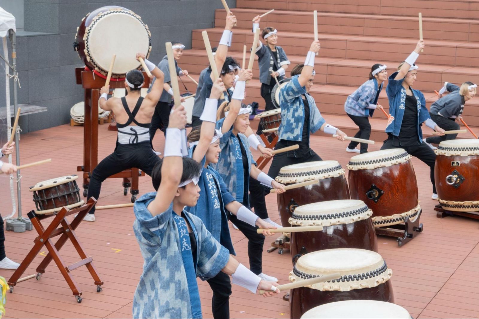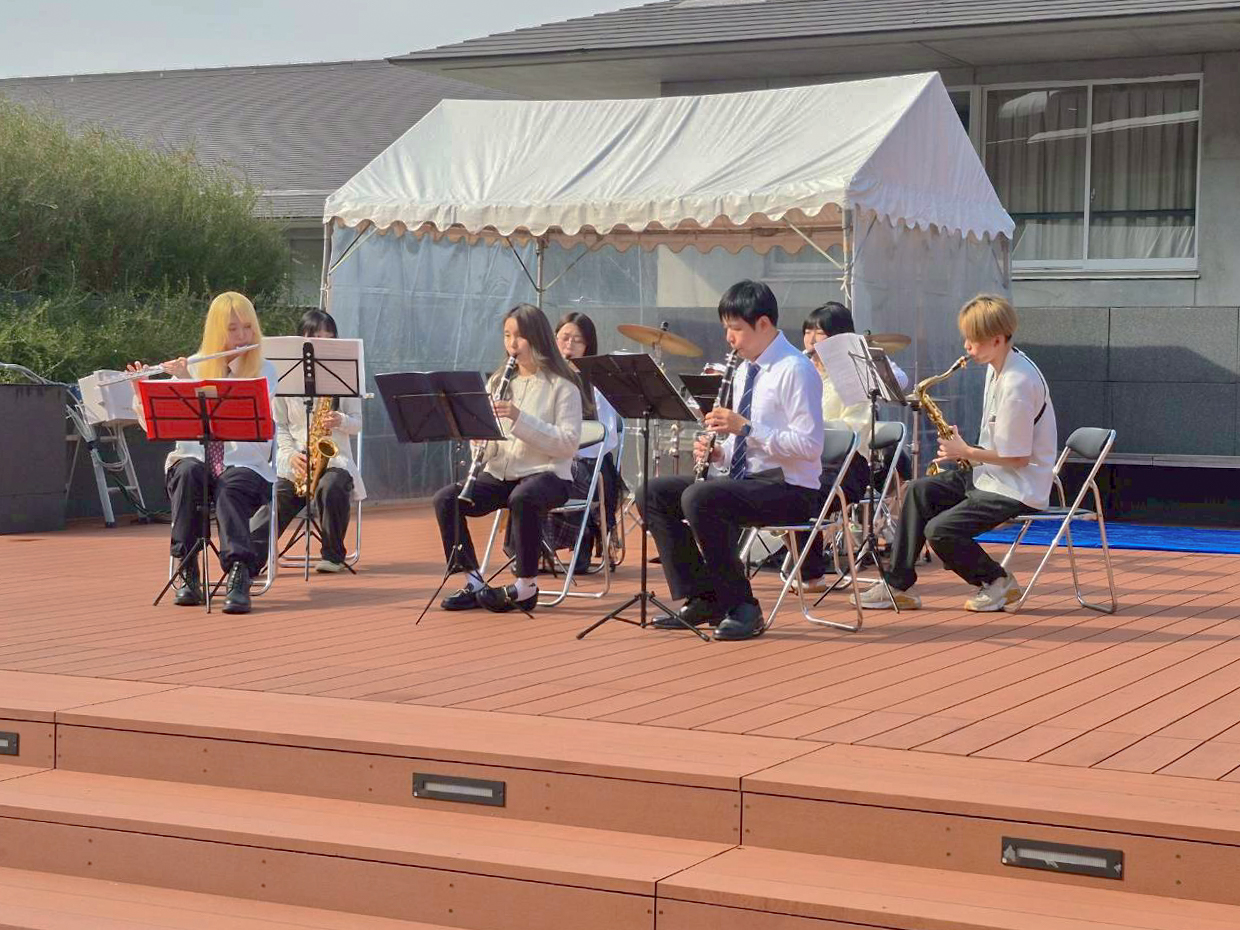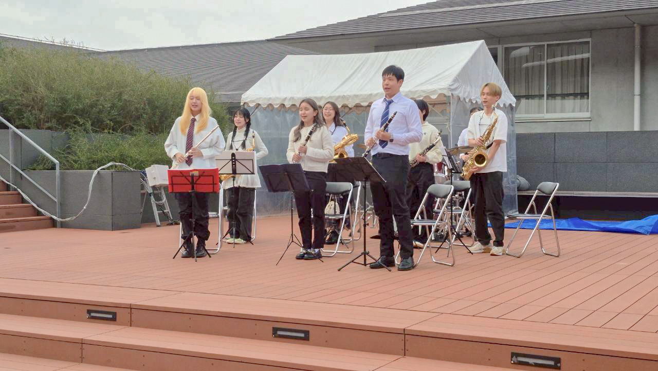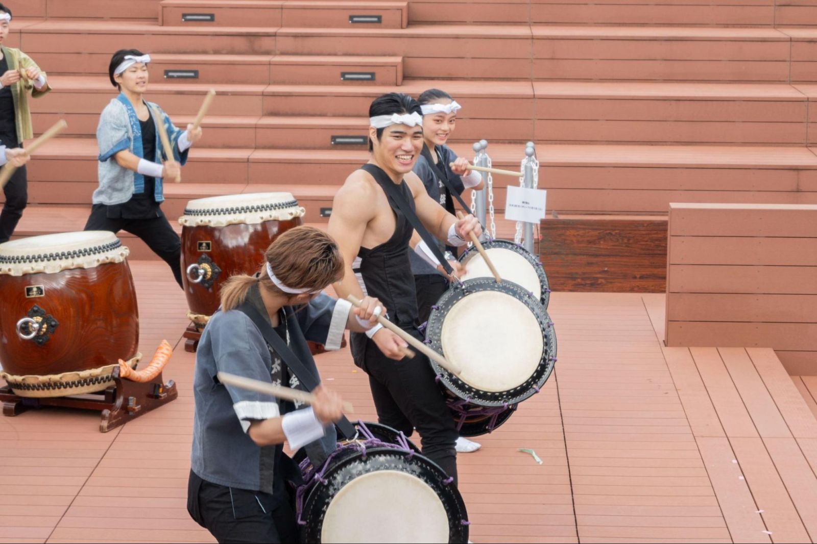 「和太鼓悳」は、学園祭の開始に合わせて、望天館屋上で「燦(さん)」など3曲を演奏し、「瓜生山吹奏楽部」は昨年のヒットソングを披露し、会場を沸かせました。学生たちの堂々とした演奏に、集まった学生や学外の方々も聞き惚れ、華々しい学園祭のスタートとなりました。