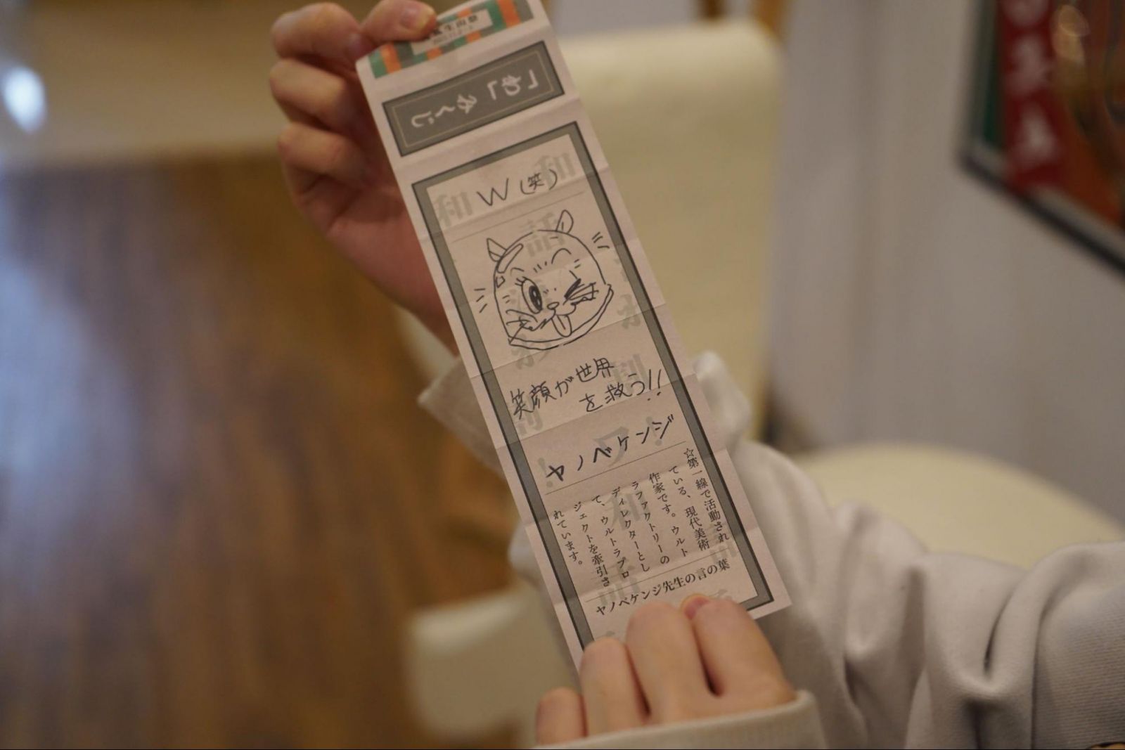 「W(笑) 笑顔が世界を救う!」の文字とともにイラストが描かれていました。ヤノベケンジ先生の「わ」みくじだったようです。こちらの「わ」みくじは装飾の一部として、参加者がみくじを引くことでイラストが少しずつ公開されていく仕組みになっていました。