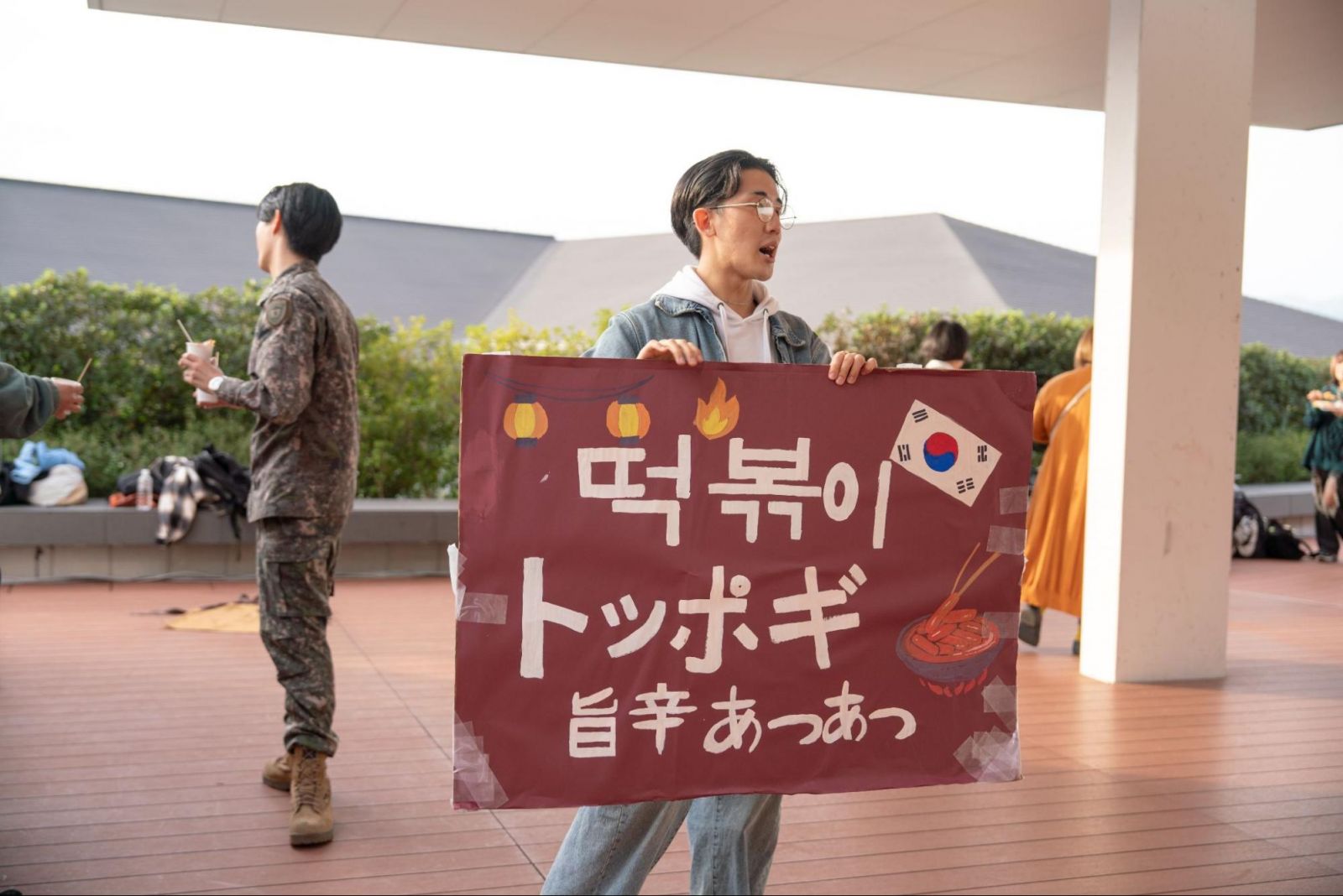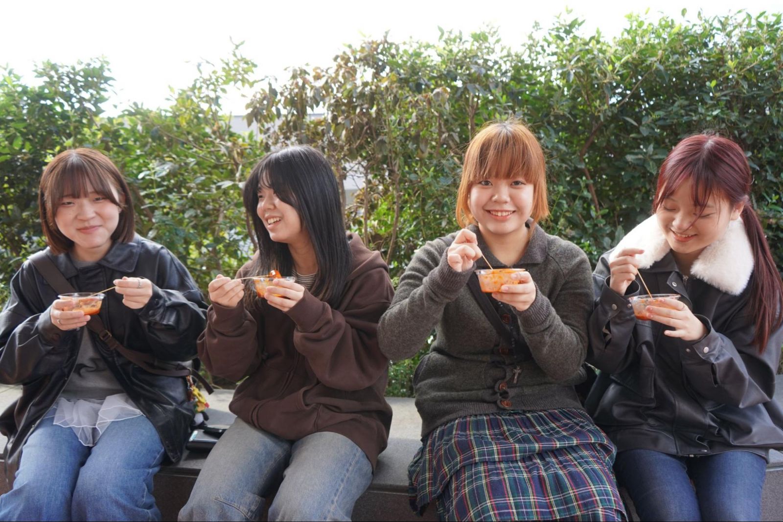 環境デザイン学科の「トッポギ」を食べていた学生たちに話を聞いてみると「辛いけど美味しいです!」と笑顔で答えてくれました。