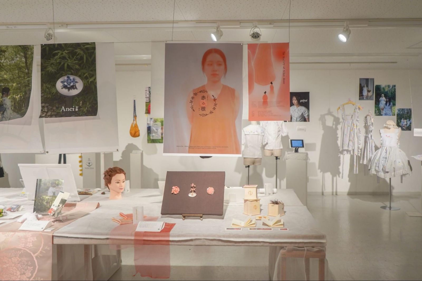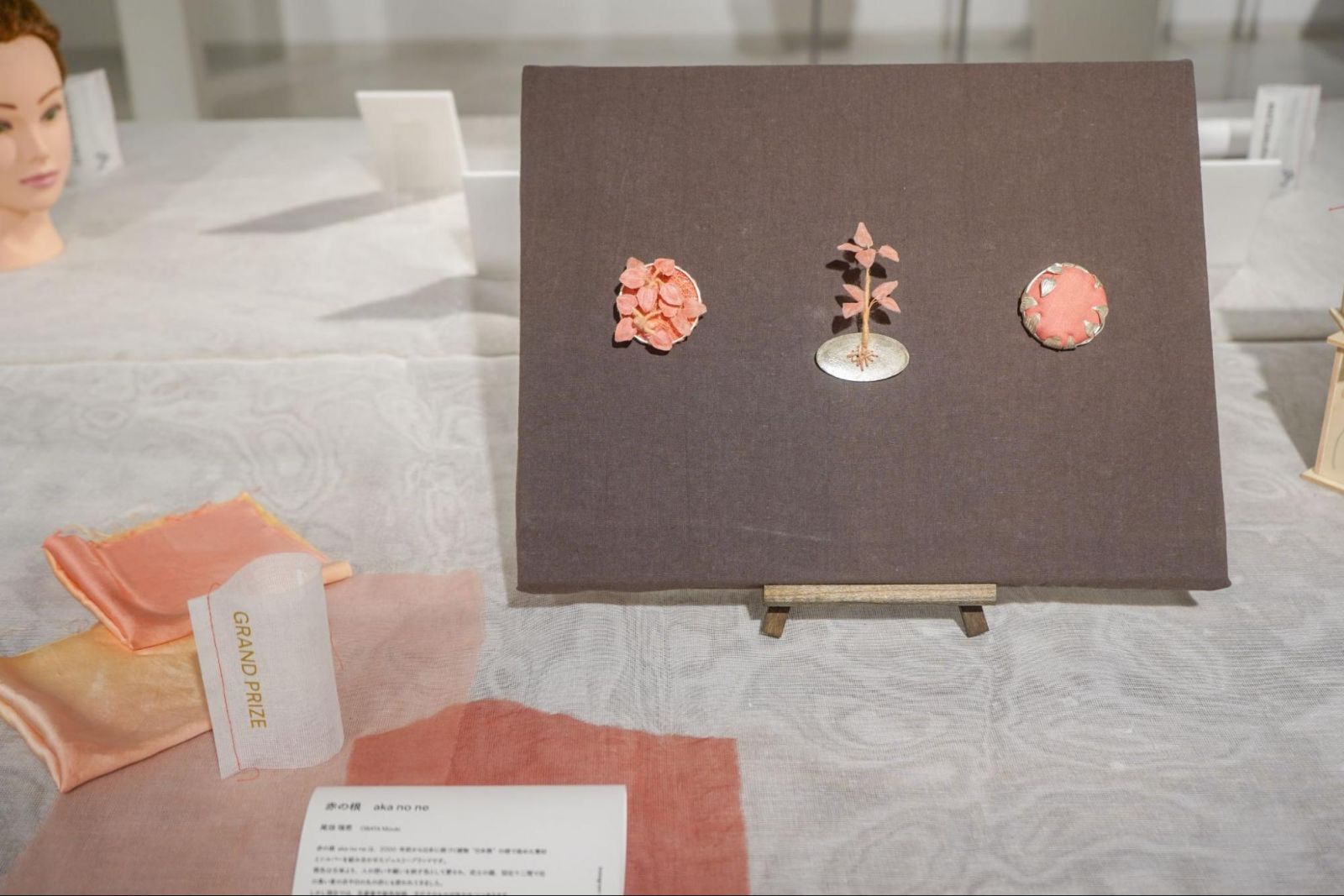 学科内でFirst prizeを受賞した尾畑瑞希さんの「赤の根(aka no ne)」は、2000年前から日本に根づく植物「日本茜(にほんあかね)」で染めた素材と、シルバーを組み合わせたジュエリーブランドです。茜色は古来より、人の想いや願いを映す色として愛され、武士の鎧、冠位十二階で位の高い者の衣や日の丸の赤にも使われてきました。しかし現在では、生産者が減少し、染めるという文化そのものが失われつつあります。尾畑さんは、日本茜を現代にもう一度根づかせ、茜色を多くの人に好きになってほしいという思いを込めてブランドを立ち上げました。