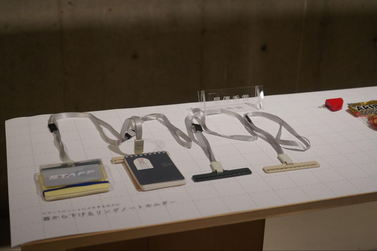 小堀さんは「ぼく自身、リングノートは持ち運びに便利なものが少なく、スマホでメモを取ることは失礼に見える場合もあるという悩みを持っていました。そこで、首から下げる方法でノートを常備するプロダクトを考えました。リングノートのリング部分に合わせたネックホルダーの形状を何パターンか試作して、この形になりました」とプロダクトについて説明します。たくさんの試作を重ねて、ノートが落ちにくい現在の形状が見つかったんですね。