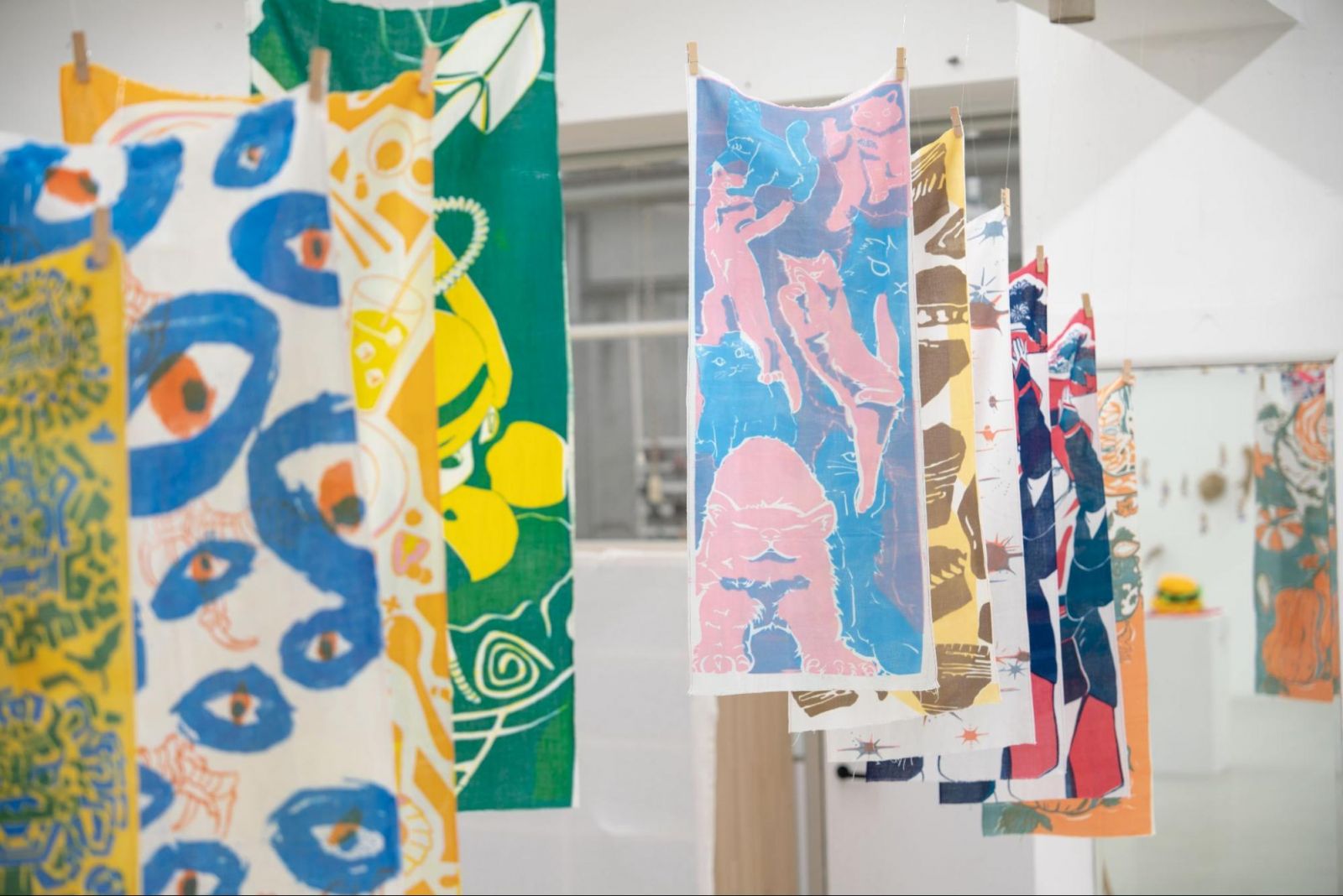 人間館C棟では、美術工芸学科の学生が日々制作する実習室や工房をギャラリー空間として、油画、日本画、立体造形、陶芸、染織、写真、映像など多様な技術や素材による作品を展示していました。授業の成果物だけでなく、自主制作による作品も多く、中には絵画作品と映像作品を組み合わせたインスタレーションも。伝統的な日本画の技法を使った作品から、現代的な漫画やグラフィックの表現を取り入れたインスタレーションまで、学生たち一人ひとりの個性が光る展示でした。