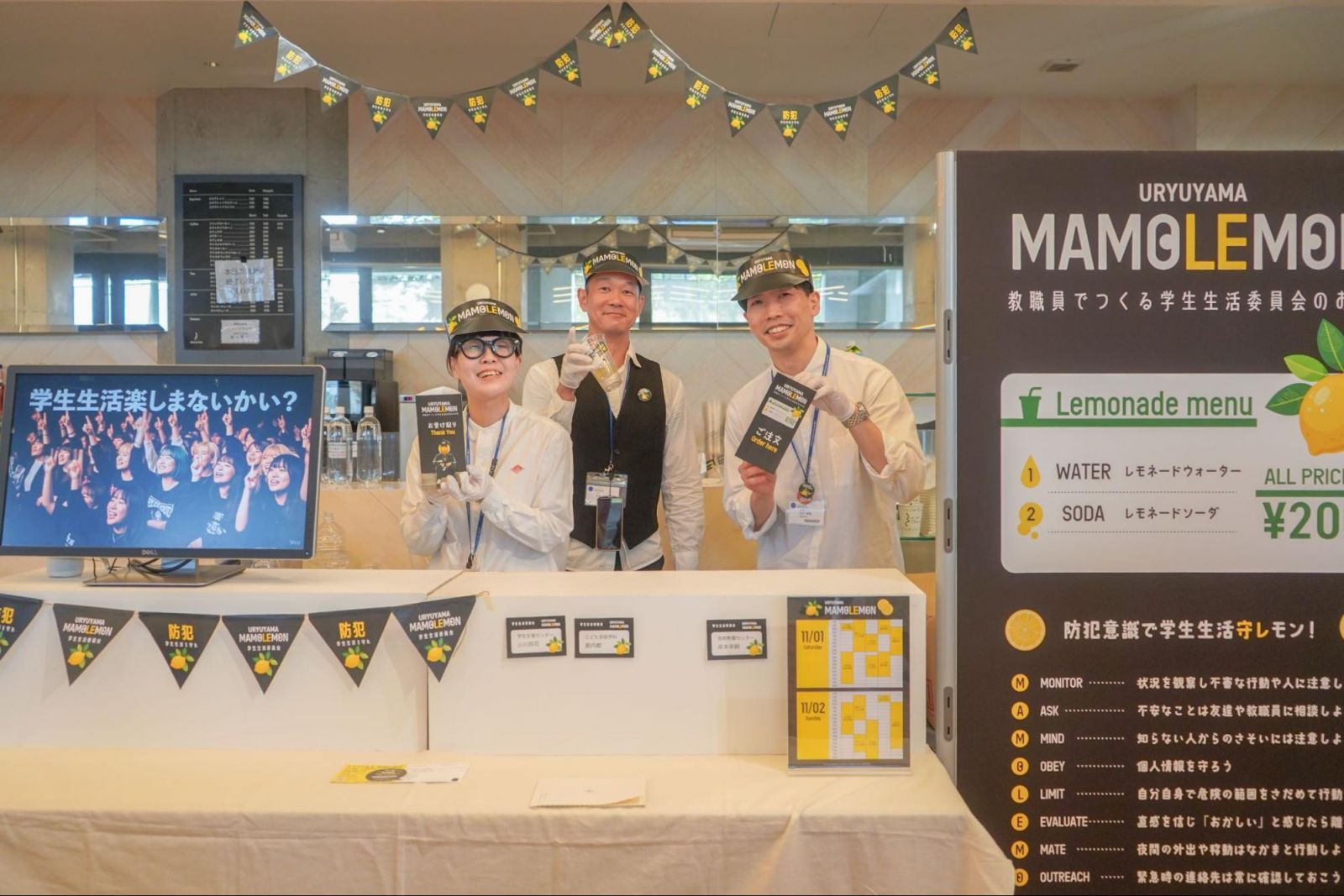 甘い匂いにつられて人間館のカフェに行ってみると、「学生生活委員会」の教職員が出しているレモネードのお店が見えてきました。なぜレモネードなのかと聞くと、防犯意識を啓蒙する標語の頭文字をとった「MAMOLEMON」にちなんでいるそう。店頭で流れている「防犯」をコンセプトにした映像は刺激的で、食い入るように見ているお客さんの姿もありました。