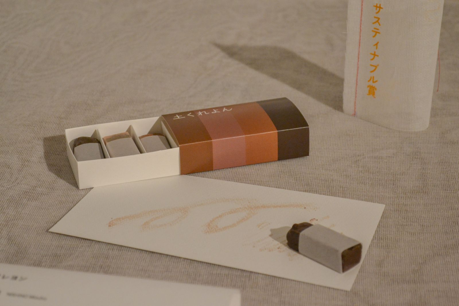 こちらはサスティナブル賞を受賞した西野瑞穂さんの「土クレヨン」です。デジタルデバイスの発達などにより、近年の子どもが土に触れる機会が減少しているという課題を解決するため、材料には身近にある公園の土を使用しています。紙に土クレヨンで絵を描くことで、描く人同士が自然を介して繋がるきっかけになり、土という素材が持つ可能性を感じることができます。