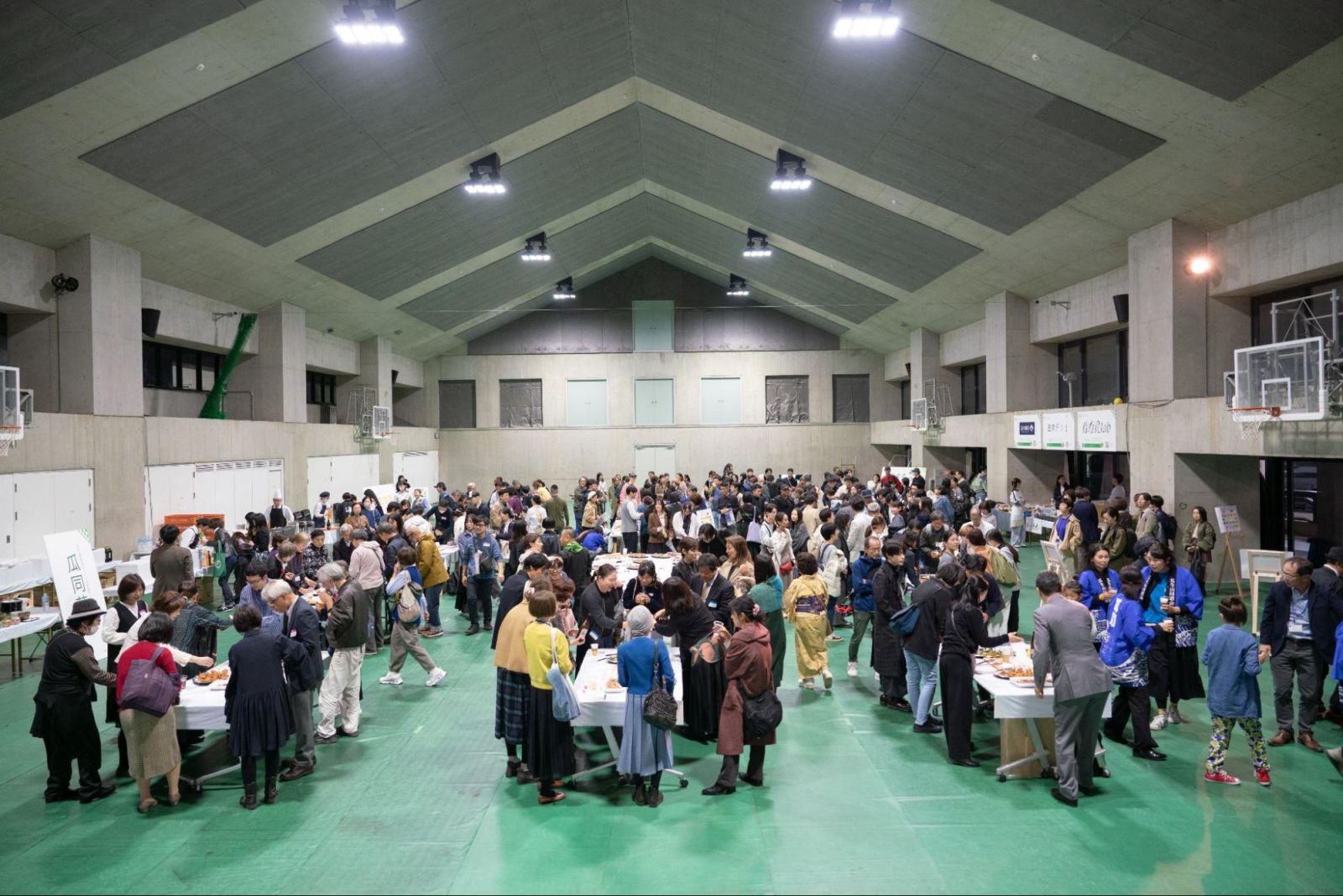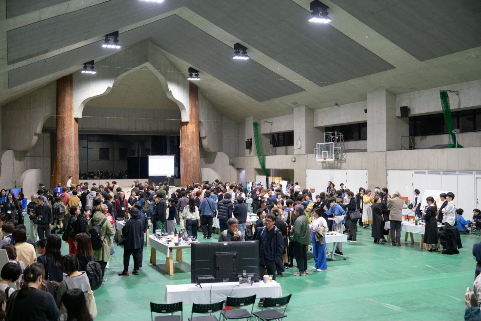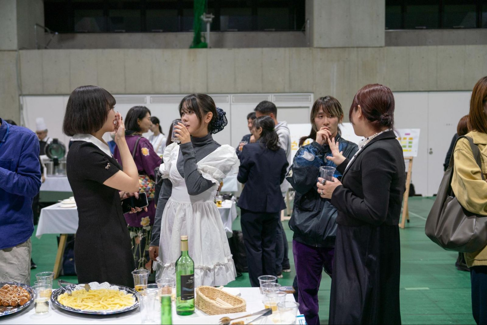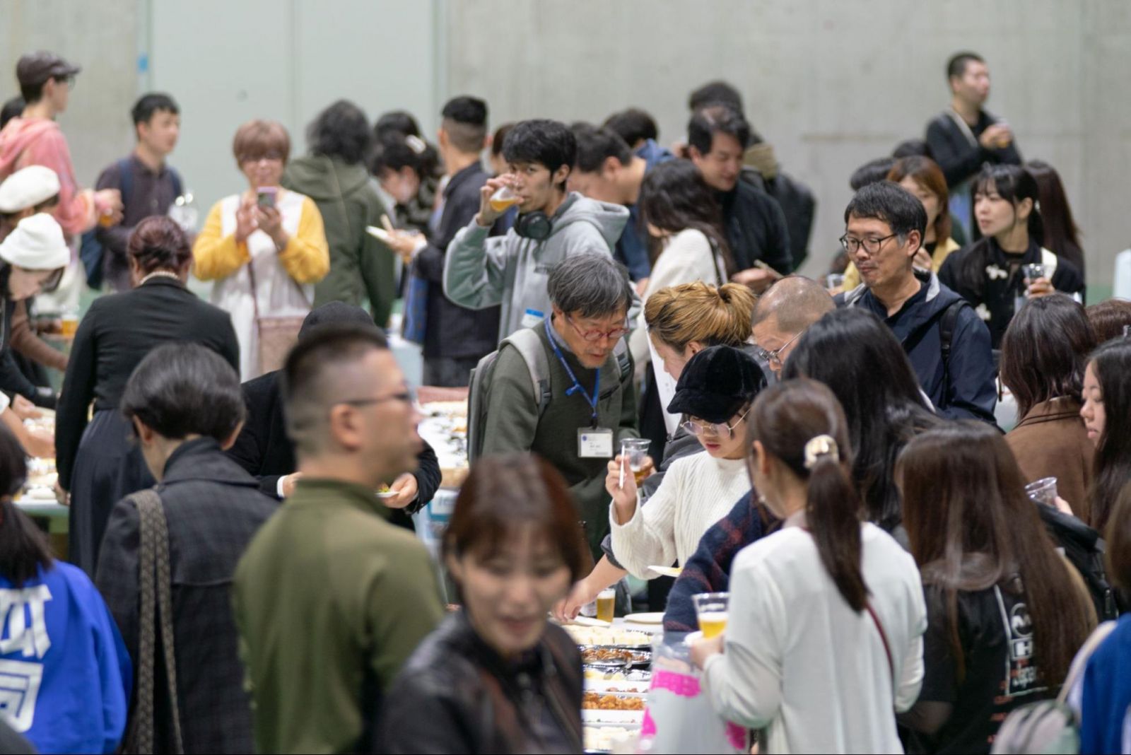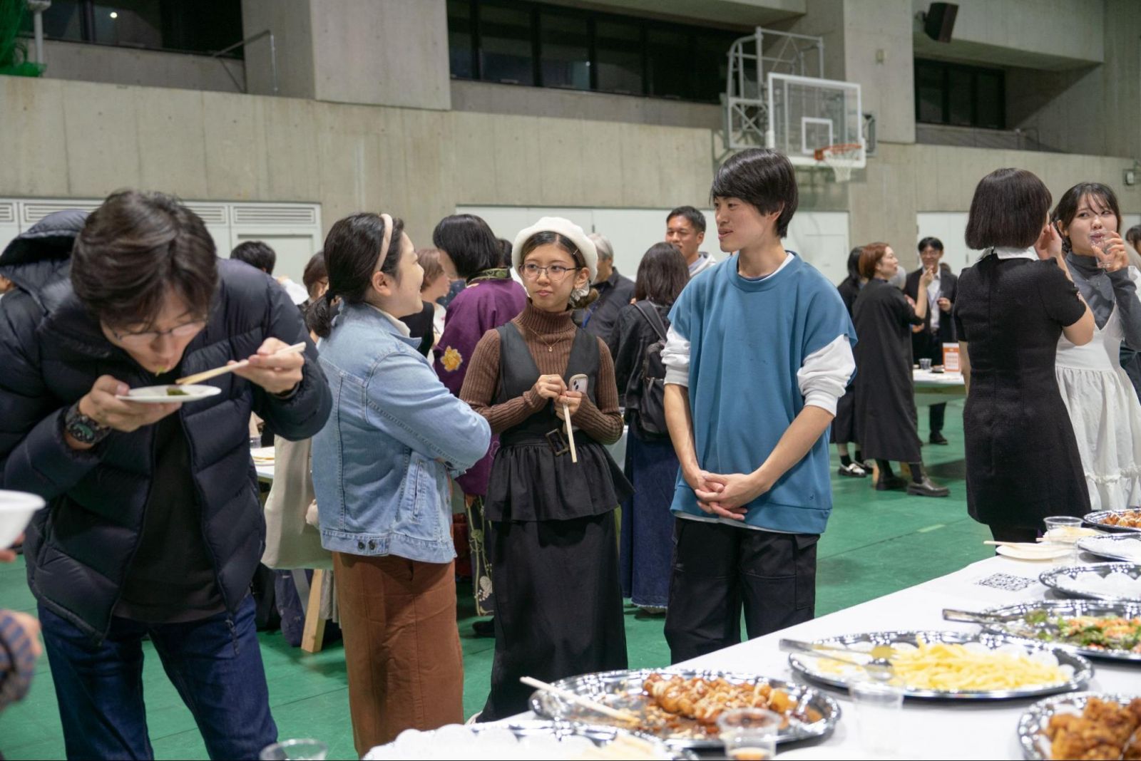 「乾杯!」の合図の後は、一気に和やかな宴会ムードに。食べ物が提供されるブースにはあっという間に行列ができ、美味しいお酒と食べ物を手にしたら、あちこちから笑い声が。旧友や先生たちとの再会を喜びあう姿が散見され、みなさん楽しそうに談笑していました。