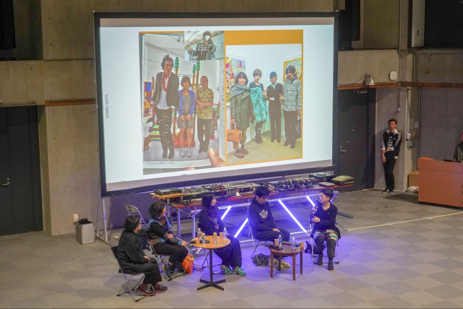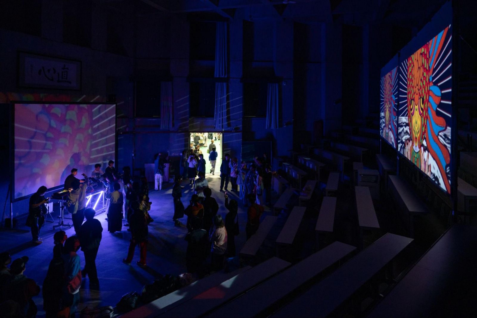 点てていただいたお茶を飲みながら、まったりとした談笑タイム……と思いきや、直心館後方からなにやらテクノ音楽が聞こえてきました。覗いてみると、暗い講義室の前方に本格的な機材が設置され、講義室後方ではアニメーション映像が流れているではありませんか。クラブに迷い込んだような雰囲気です。