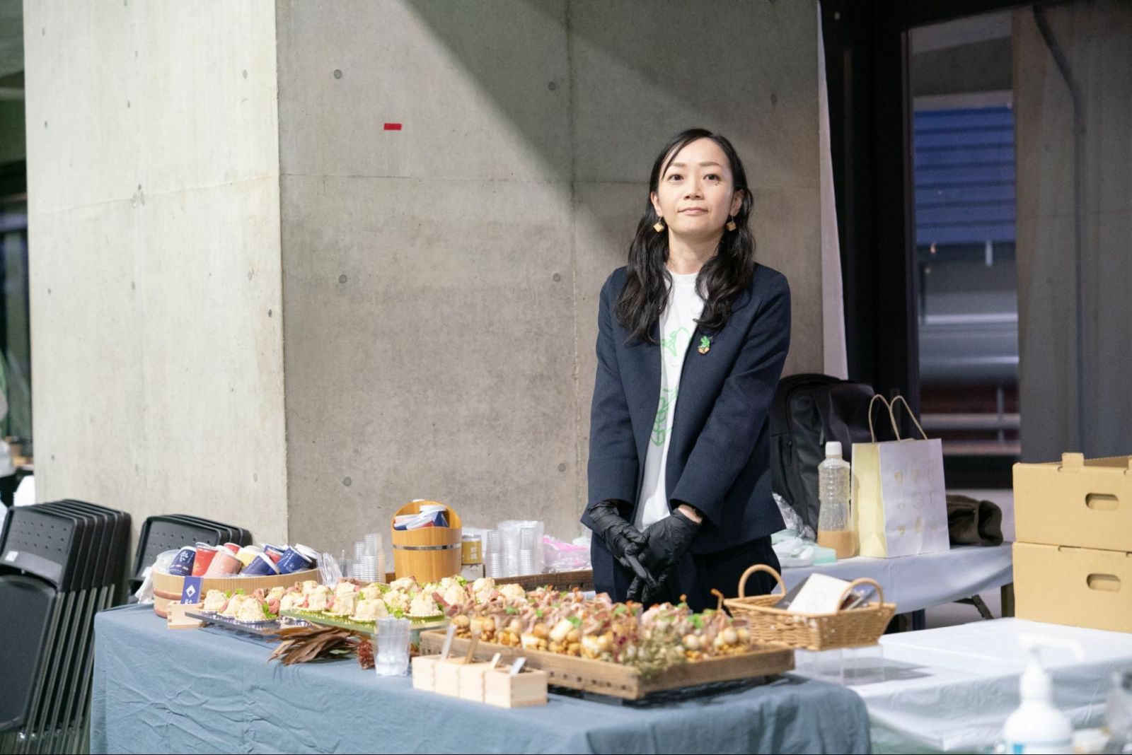 環境デザイン学科卒業生・益田藍さんの「益や酒店」からは、飲み比べできる日本酒と日本酒に合う酒肴をご提供いただきました。益や酒店は2015年の開業以来、地元の常連客や観光客、外国からの旅行者など多くの人が気軽に通える日本酒バルとして注目を集め、現在は缶入り日本酒とおつまみの製造販売も手がけています。