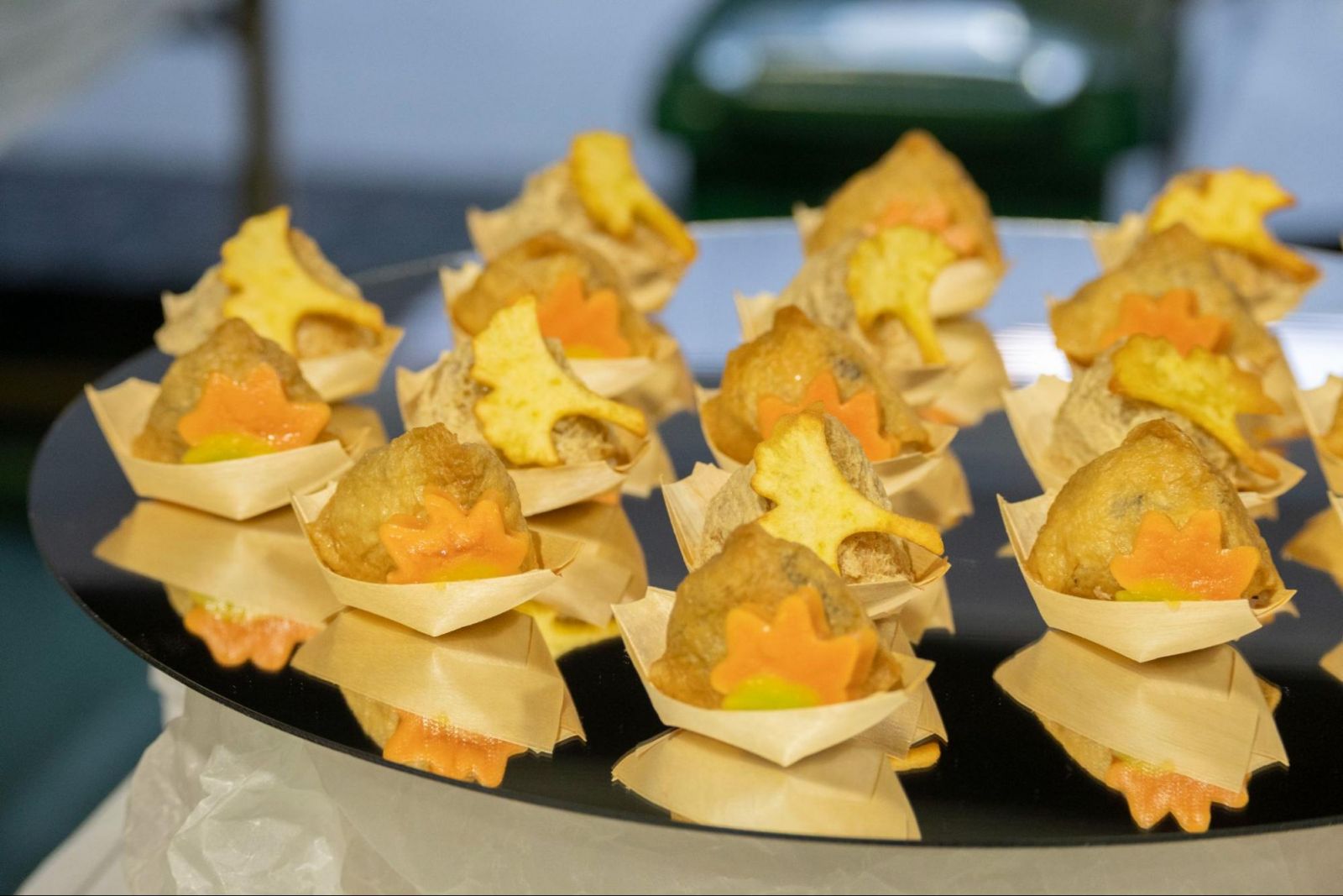 美術工芸学科卒業生の増本奈穂さんが店主を務める「保存食LAB」からは、温かなスープにあっさりとした米麺を使ったフォーと、3種類のフィンガーフードをご提供いただきました。大きなエビの乗ったパイや秋らしい色合いのお稲荷さんなど、写真映えするフィンガーフードはすぐに来場者のハートを掴み、我先にと手を伸ばす人で溢れていました。