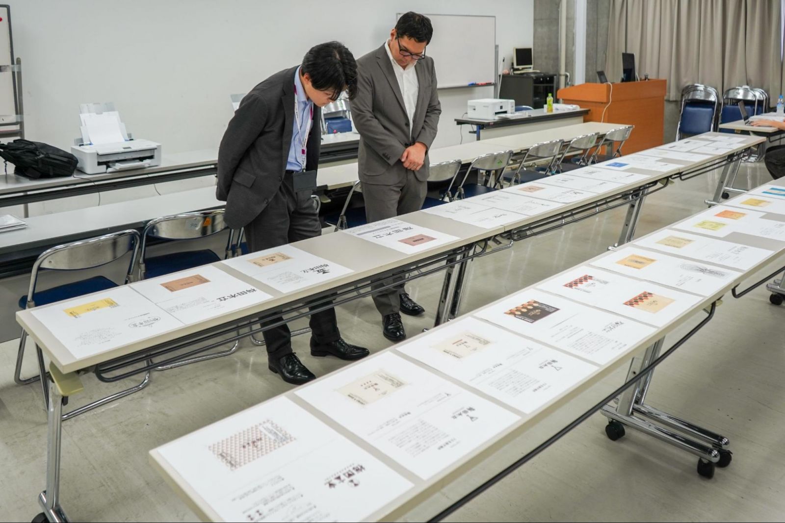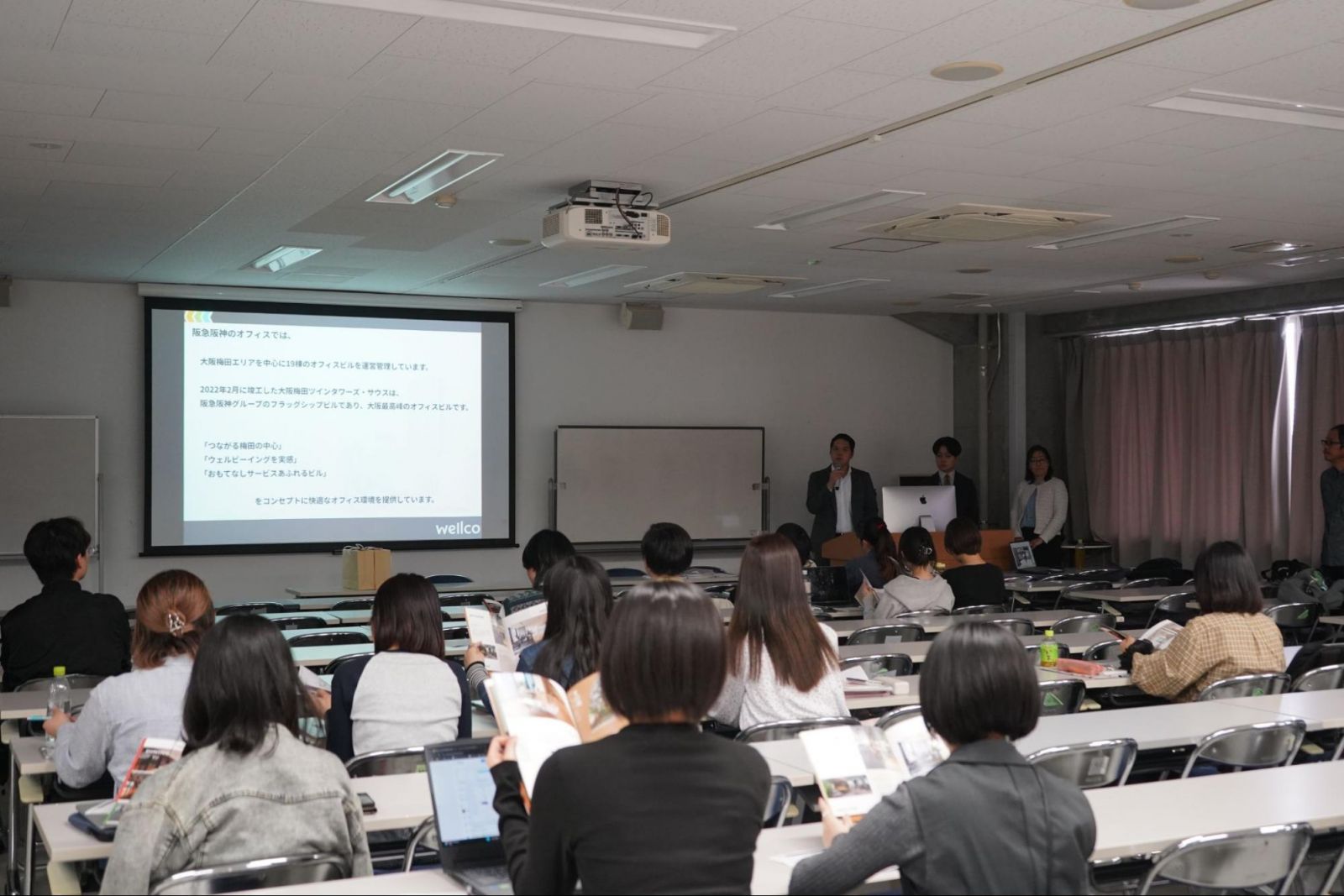 ロゴデザインの中間発表では、阪急阪神ビルマネジメント株式会社の社員の方々が来校され、それぞれの学生のデザイン案に対してフィードバックを述べられました。中間発表は、学生が自分の考案したデザインを机に並べ、社員の方々が順に回るという形式で行われ、短い時間でコンセプトを伝える力も問われました。