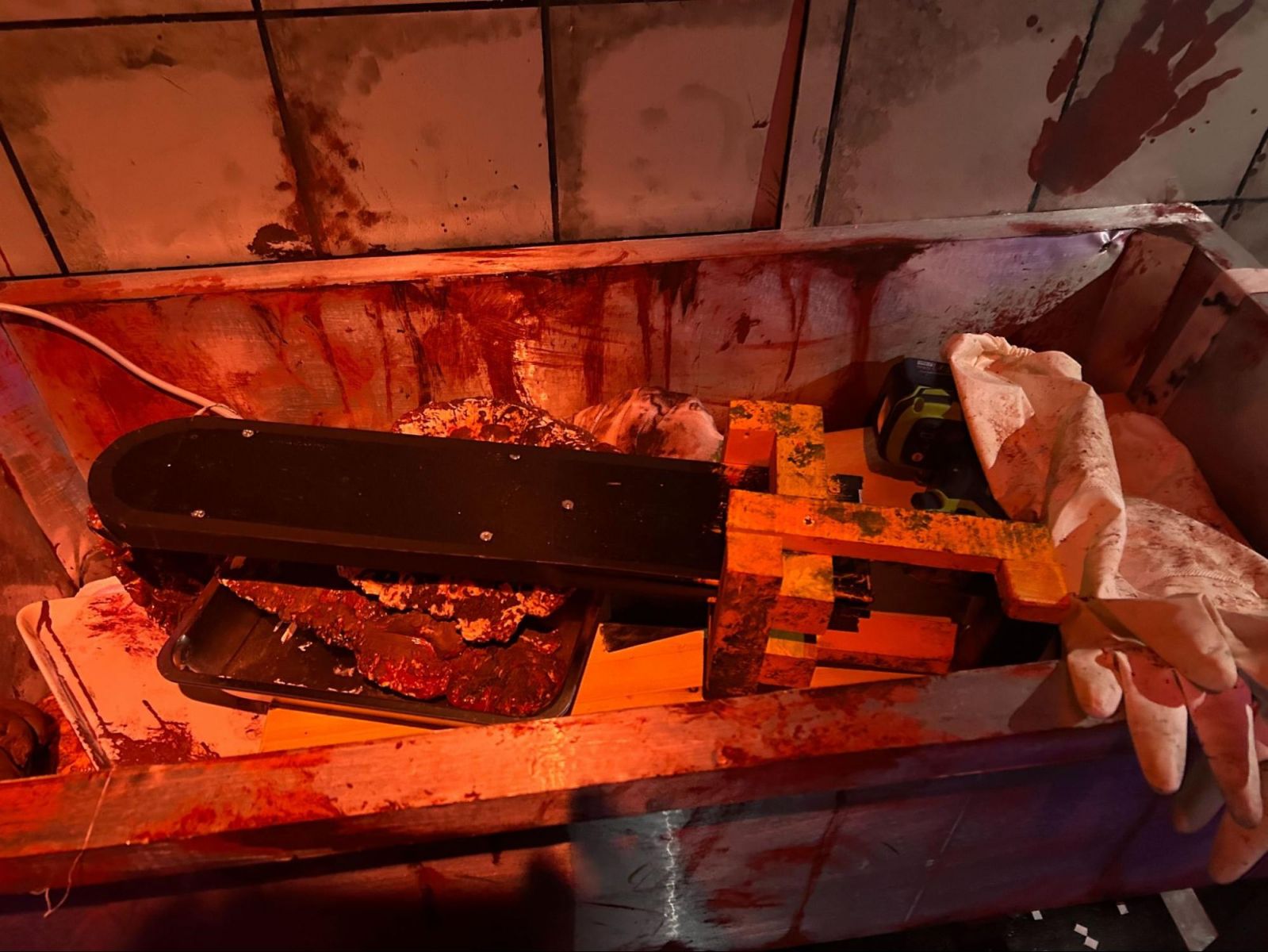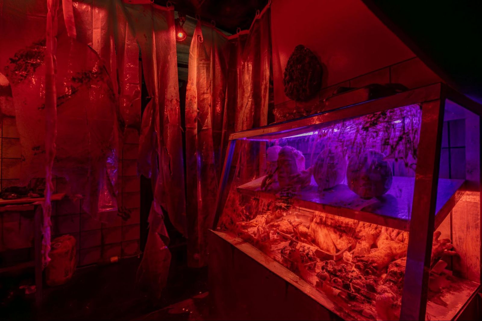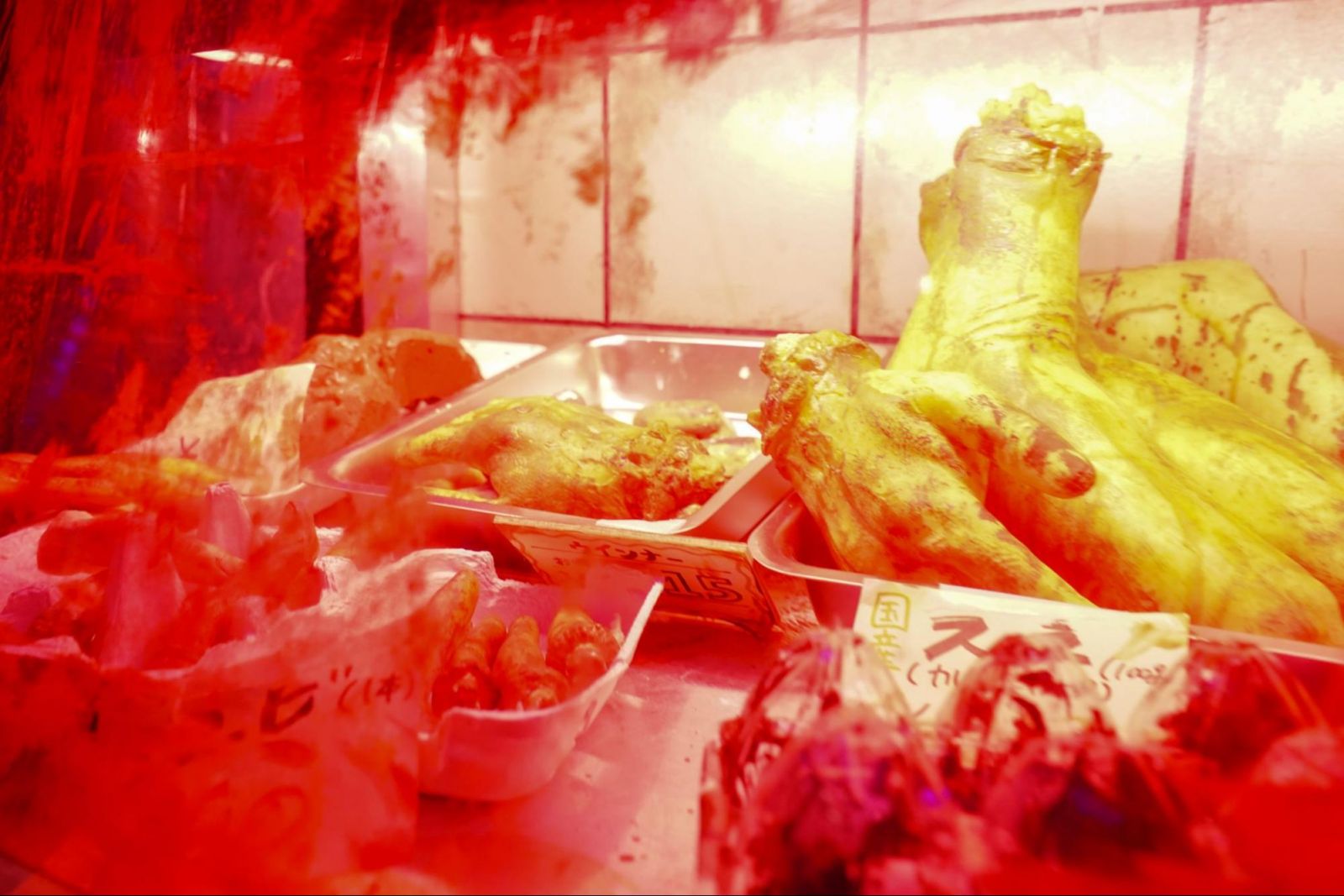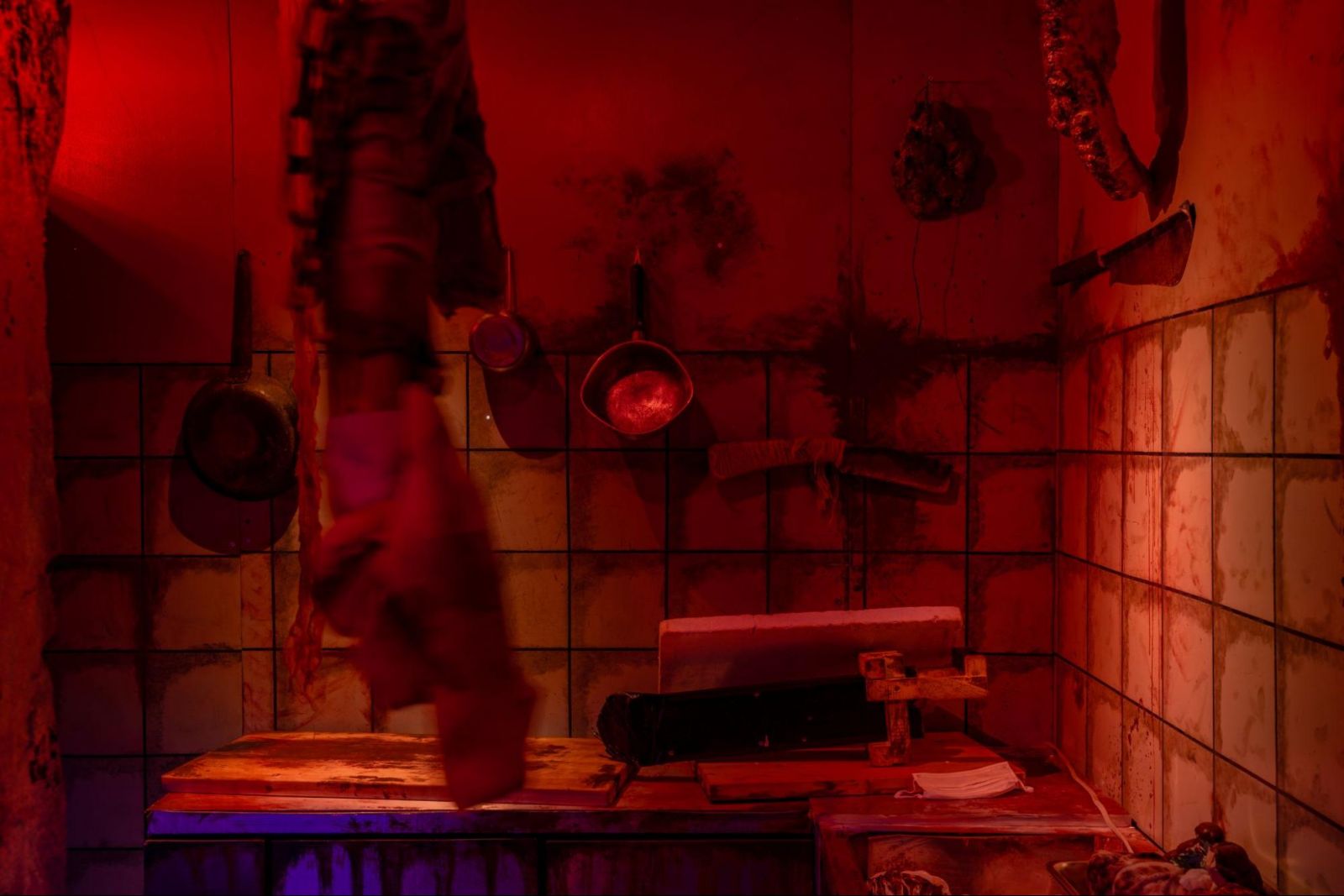 電気屋同様、腰をおって次の部屋に入ると、まずは視線を釘付けにするガラスケースがありました。ガラスケースにはお肉やコロッケの値札があるので、ここは精肉店なのでしょう。ですが、ガラスケースの中に入っているのは本物の肉や食品レプリカではなく、切断された人の顔とそれを支える手です。それだけでも十分ホラーですが、ガラスケースの奥からは肉を引き裂くチェーンソーの音が鳴り響いていました。