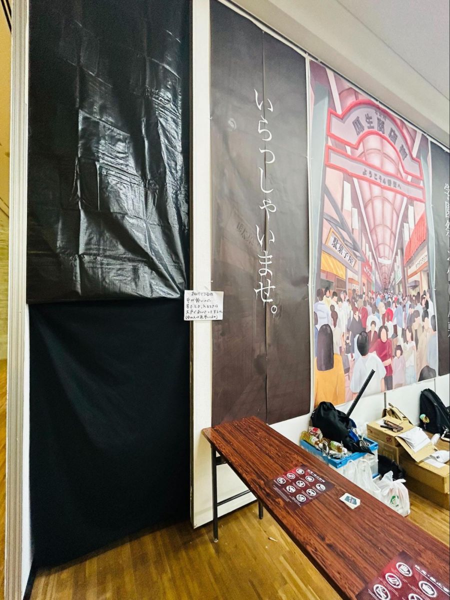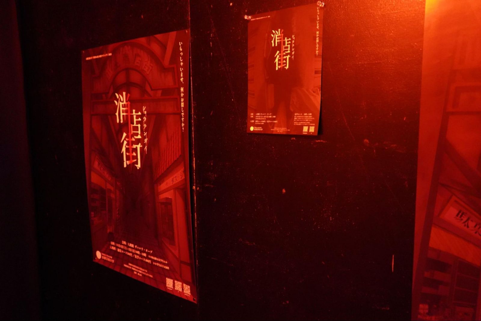 受付を済ませ暗幕をくぐると、最初に案内されるのは二つの待機エリア。『消店街』のポスターとPVを連続で眺めながら、お客さんは少しずつ日常の世界からお化け屋敷の世界へと感覚を切り替えていきます。