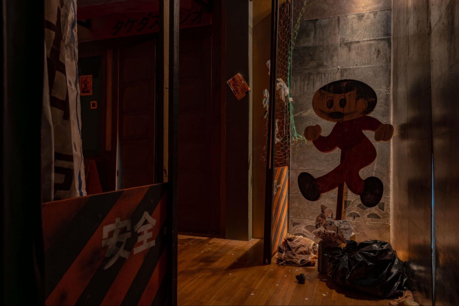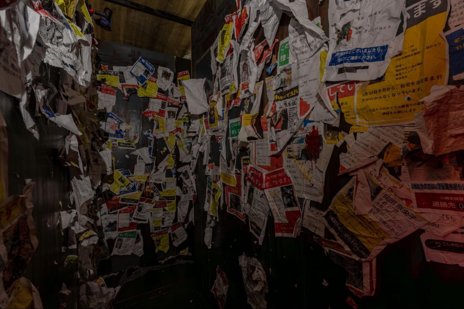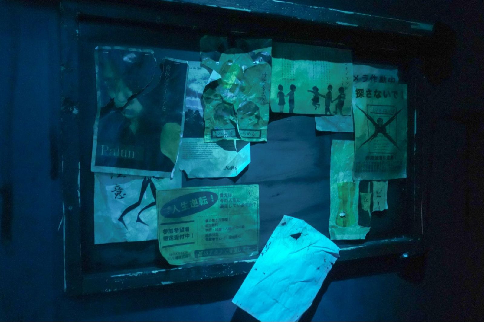 武田さん「お化け屋敷は3つのメインストリートを辿る構成だったと思うんですけど、どんどん廃れていく演出を壁で見せることにこだわっていました。壁っていうのはメインストリートだけじゃなくて、裏路地や店舗の壁も含まれています。最初の路地から次の路地、その次の路地に進めば進むほど廃れていく。照明やチラシの状態でも感じてもらえたかもしれないですけど、壁からも感じてもらえるように工夫していました」