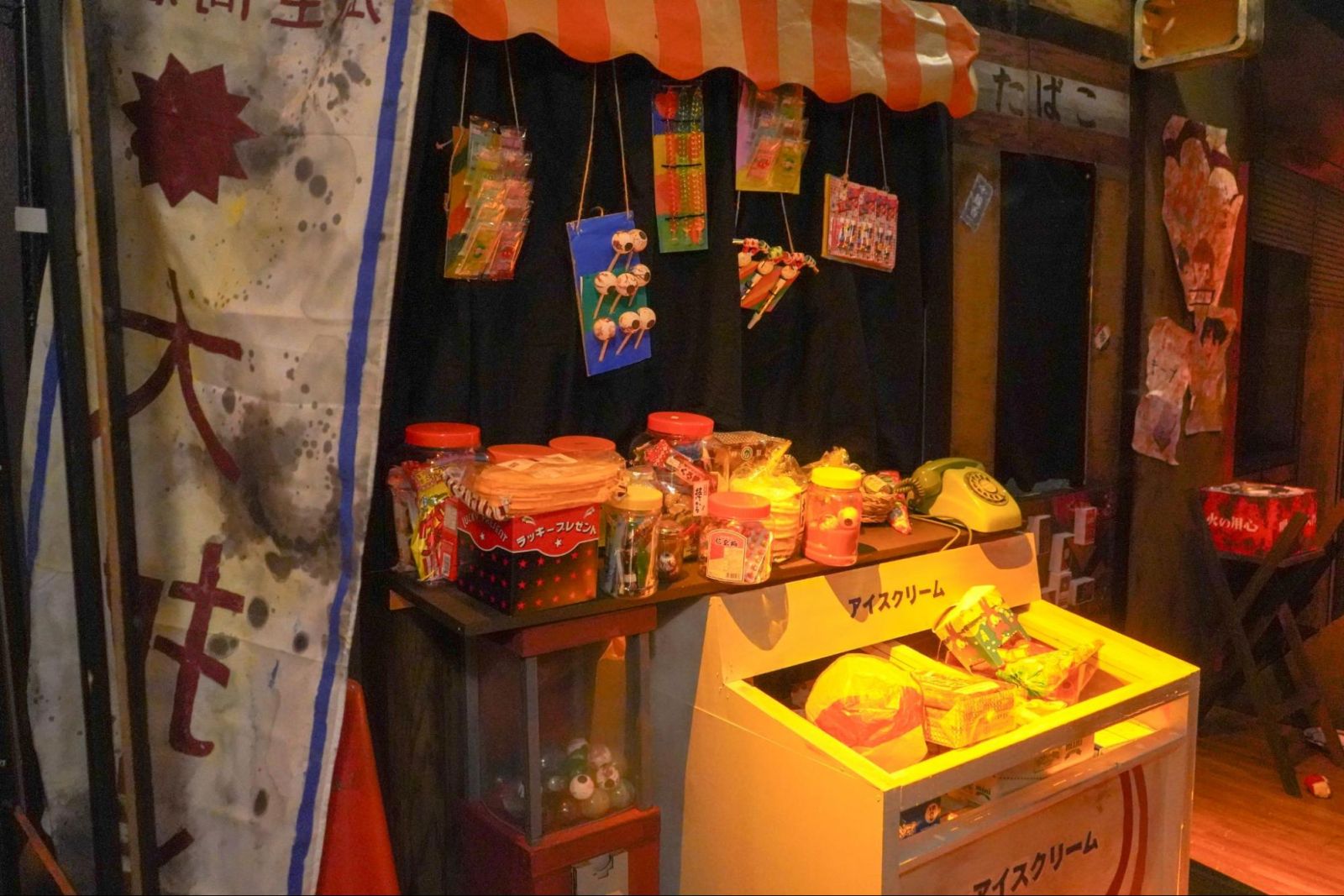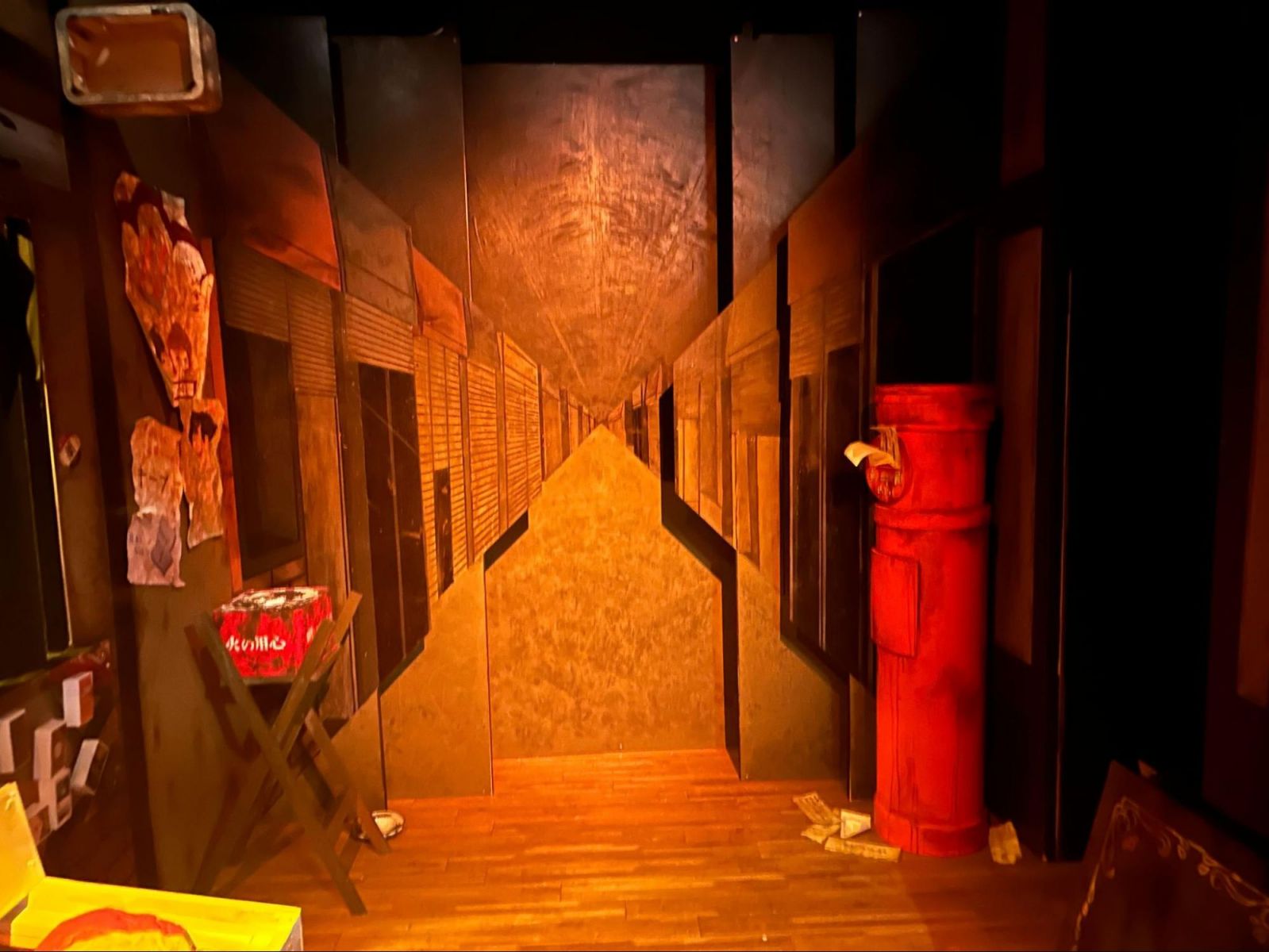 アイスクリームを収納した冷凍庫、写真館からもれでる不気味な光、店先に立つポストなど細部までこだわりを見ることができ、実際にどこかの町の商店街に迷い込んだような感覚になります。その中でも特に目をひいたのがメインストリートの奥行きを演出している屏風です。複数のパネルを連結させることで、商店街がどこまでも続いていくような奥行きを演出しており、そのクオリティに思わず唸ってしまいました。
