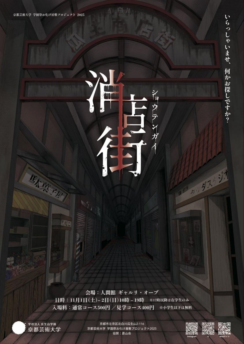 京都芸術大学の学園祭「大瓜生山祭」にてお化け屋敷プロジェクト『消店街』が開催されました。『消店街』とはそのタイトルの通り、外から訪れた人が「消失」するという噂の商店街を舞台にしたお化け屋敷です。