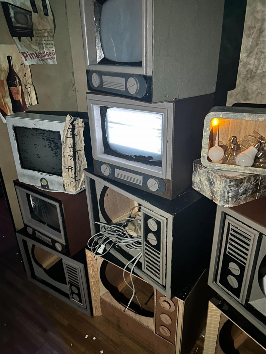 最初に見たアニメーションや砂嵐を映したテレビが乱立していて、見ることに集中していると、後ろからスタッフが突然脅かしてくるので、集中しすぎることはお化け屋敷では仇になりますね。