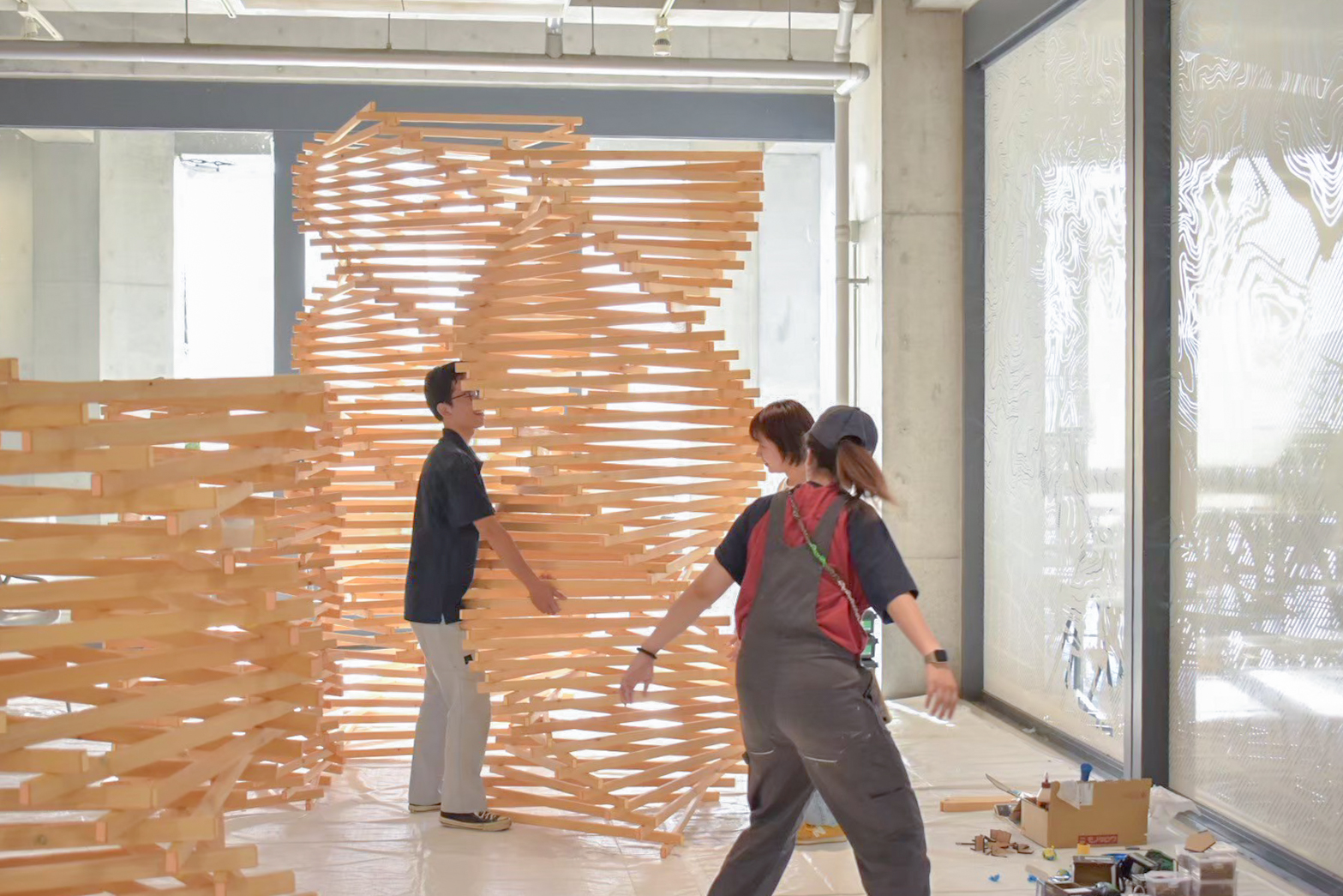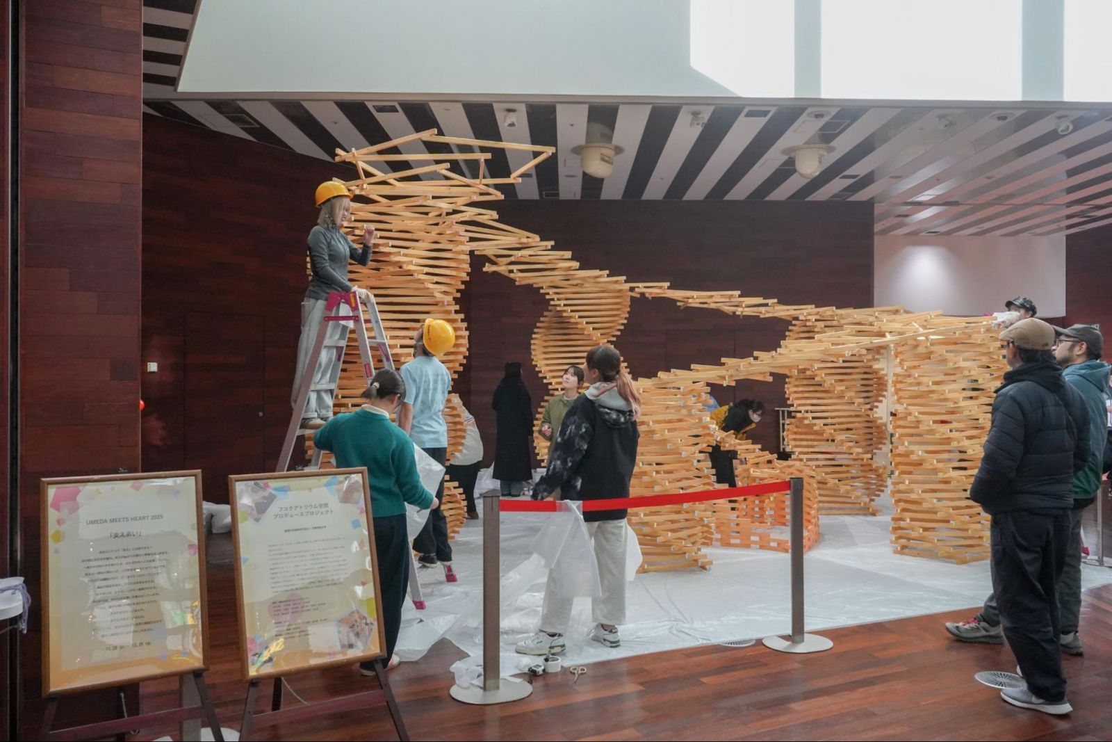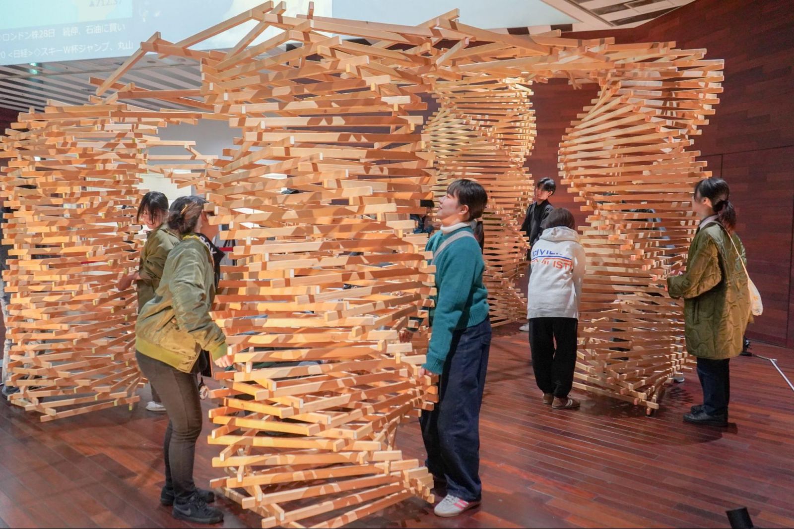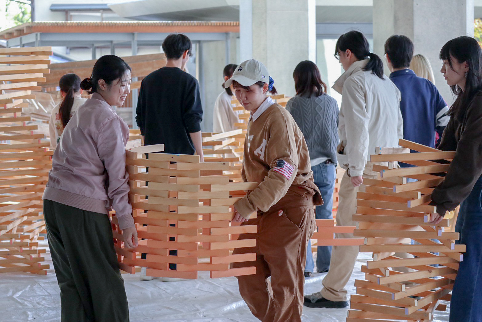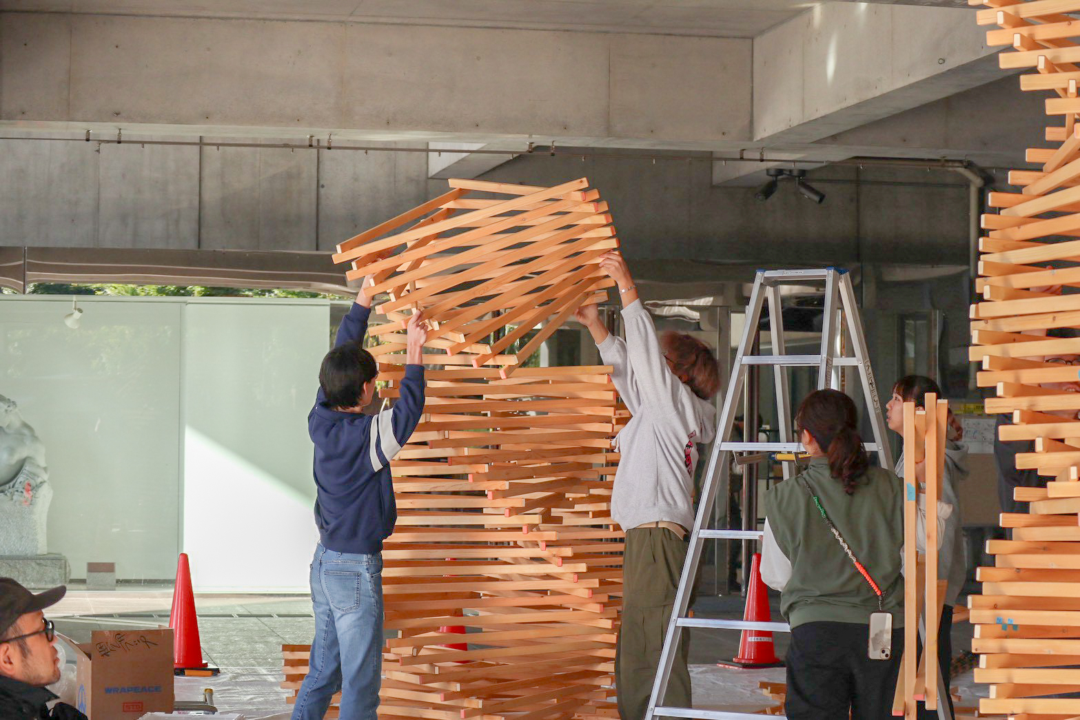 1000本をこえる木材が、角度を調整され、位置を整えられ、少しずつ支え合いながら立ち上がっていく。その過程はまるで、学生たち自身の姿を映しているようでした。