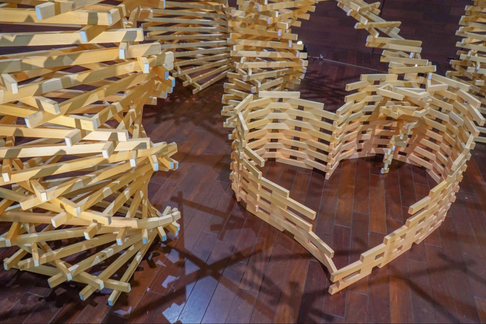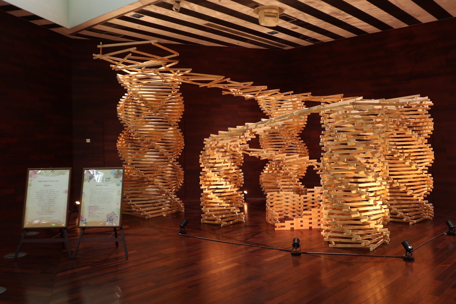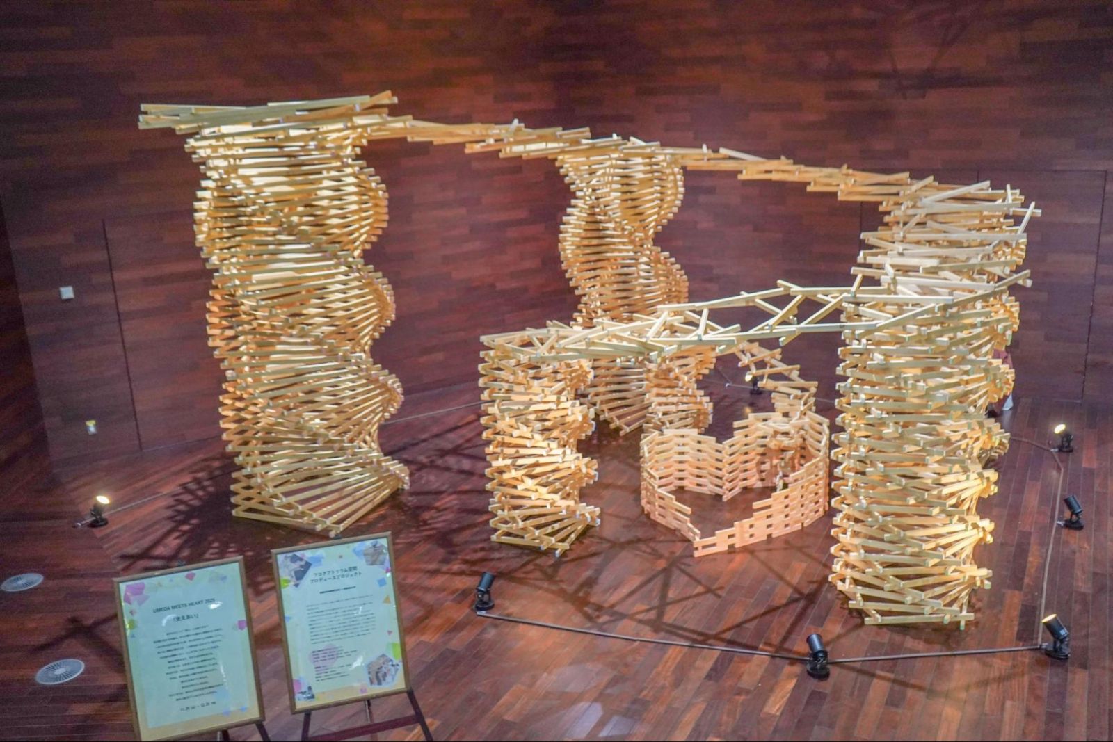 作品は、木と木が支え合うように組まれた螺旋構造で構成され、さりげなく“ハート”のモチーフも忍ばせています。