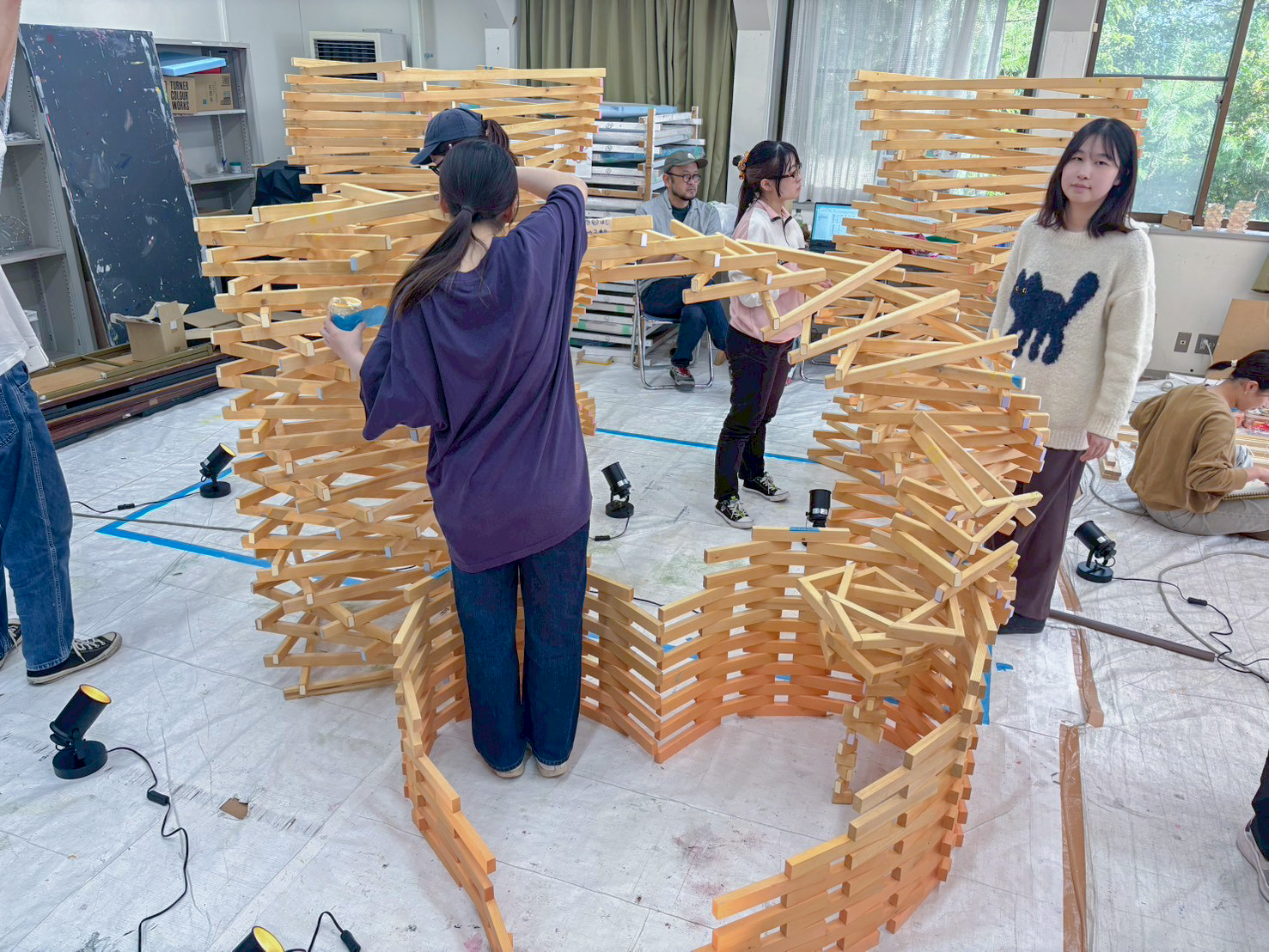 田中さん:「中間展示までの12日間は、本当に“走り抜ける”感覚でした。芸教祭の展示があったので、まずはそこに向けて形をつくる必要がありました。とにかく時間がなくて、毎日ずっと作業していた気がします。でも、木材の角度が少しズレるだけで作品の形が変わってしまうので、誰かが押さえて、誰かが角度を見て、誰かが固定して…作業そのものが《支えあい》になっていました」