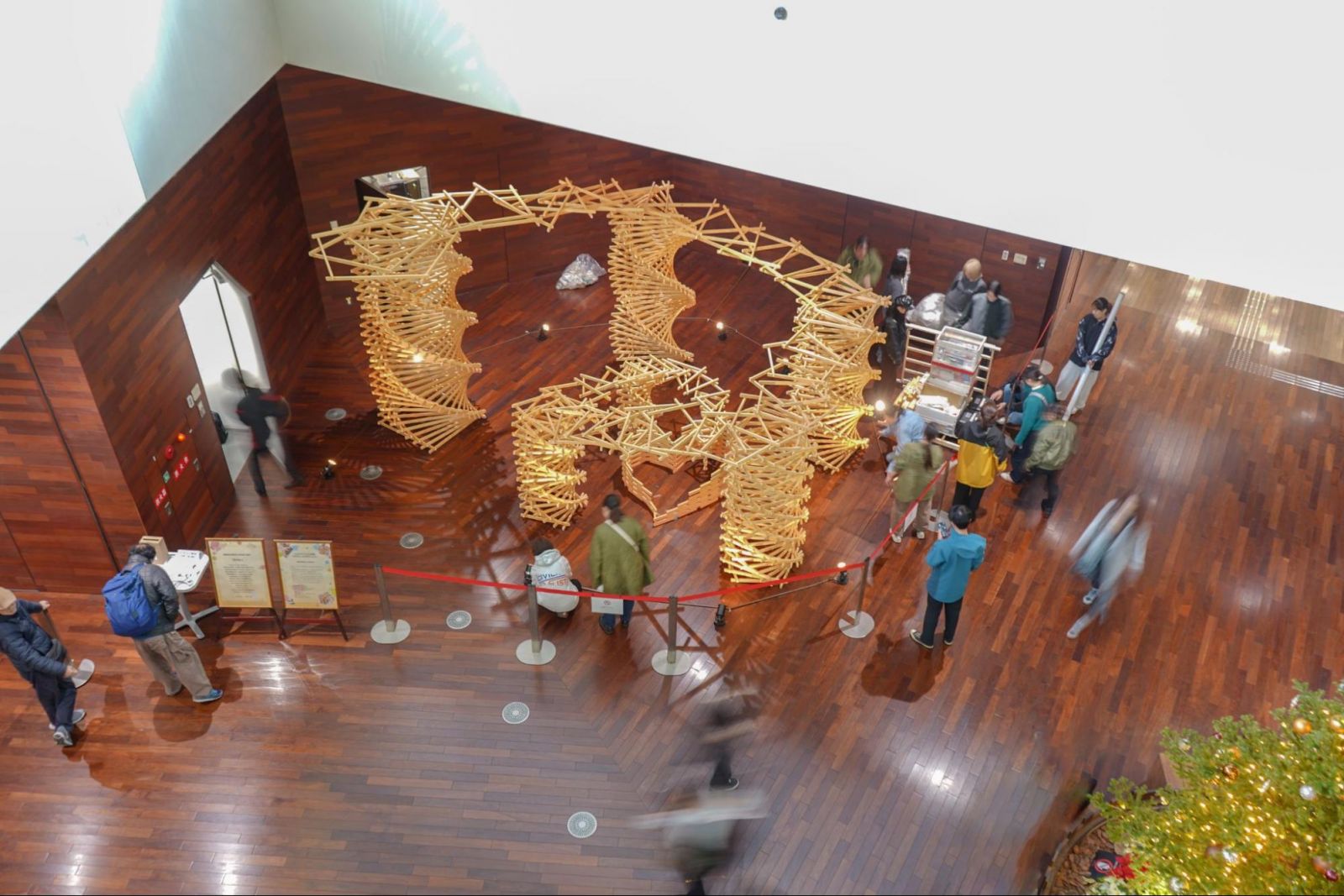 今年は、1000本を超える木材が折り重なるように立ち上がり、 木が木を支える構造そのものが「人と人のつながり」を表すような作品が完成しました。