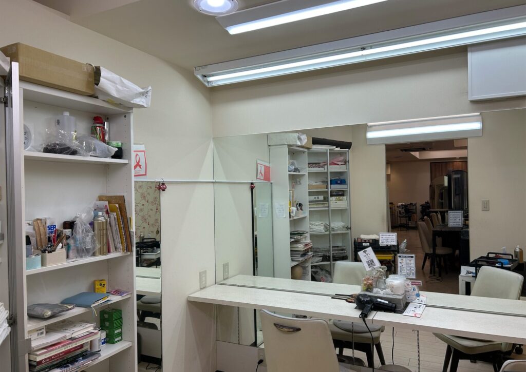 キヌ美容室には69歳まで在籍し、のち、ディティールさんに移ることになります。広い美容室ですが、入口入ってすぐのところに乙野さん専用のお部屋があります。よく見ると他はオレンジ色の照明なのに対して、乙野さんのお部屋だけは白い蛍光灯。これは洋髪だけでなく、毛一本一本の流れすら誤魔化しの効かない日本髪を結うからなんだそう。実は現役の舞妓さんの頭を結いながら、洋髪のセットもしている美容師さんは京都で乙野さんただ一人。他にもサイドに鏡があったり、こだわりの詰まったお部屋からこの仕事への熱意をじりじりと感じます。今回は実際に洋髪を結われているところも見させていただきました。