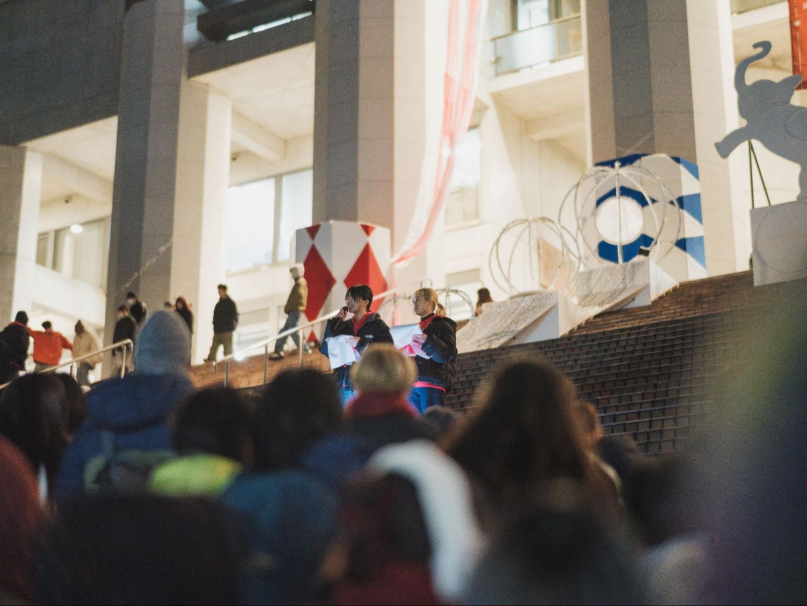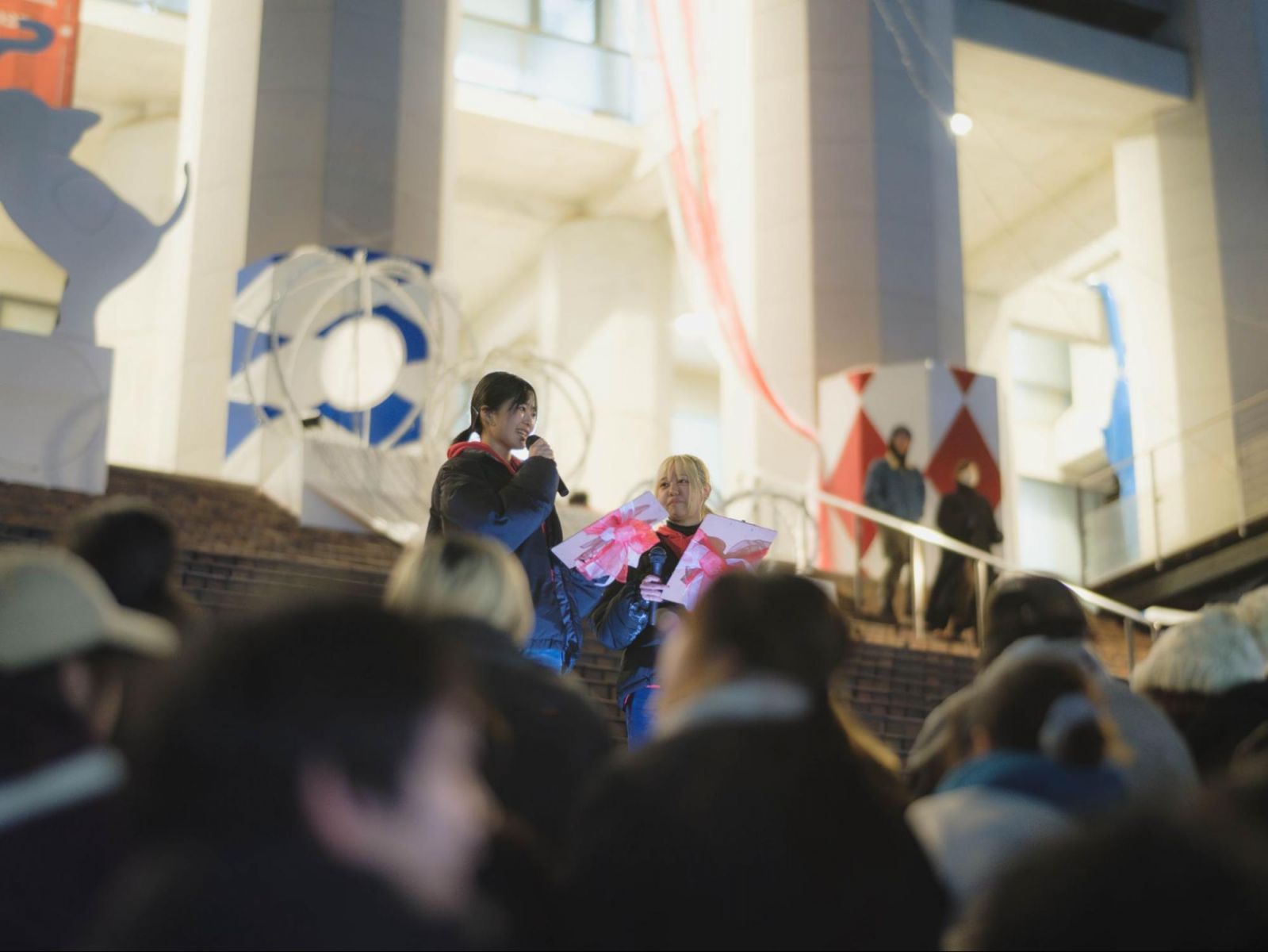 やがて、赤いパーカーに身を包んだ司会の竹本杏菜さん(総合造形コース|1年生)と松村知夏さん(ビジュアルデザインコース|1年生)が登場。本プロジェクトの歴史や今年のイルミネーションのタイトル、その意味をお話してくれました。