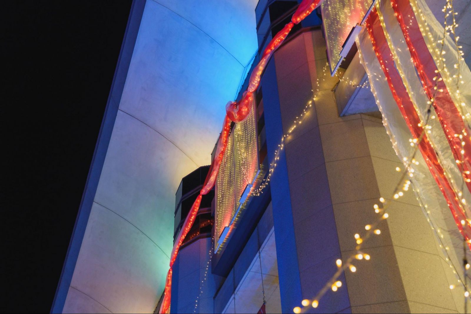 オーガンジーは光沢感のある素材。イルミネーションの光を受け、空間をより煌びやかに演出しています。
