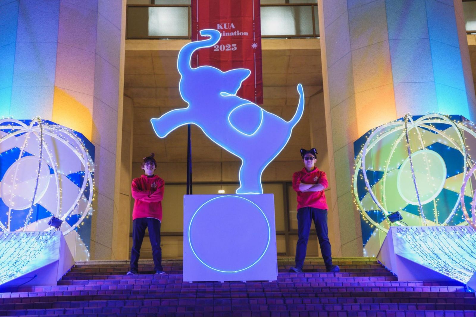 両脇に設置された丸いオブジェクトは回転しながら点滅しています。そしてひときわ目を惹くのは、真ん中に設置された丸いイルミネーションの上に乗ったゾウのオブジェクト! まるで本当にサーカスでゾウがパフォーマンスをしているような迫力です。